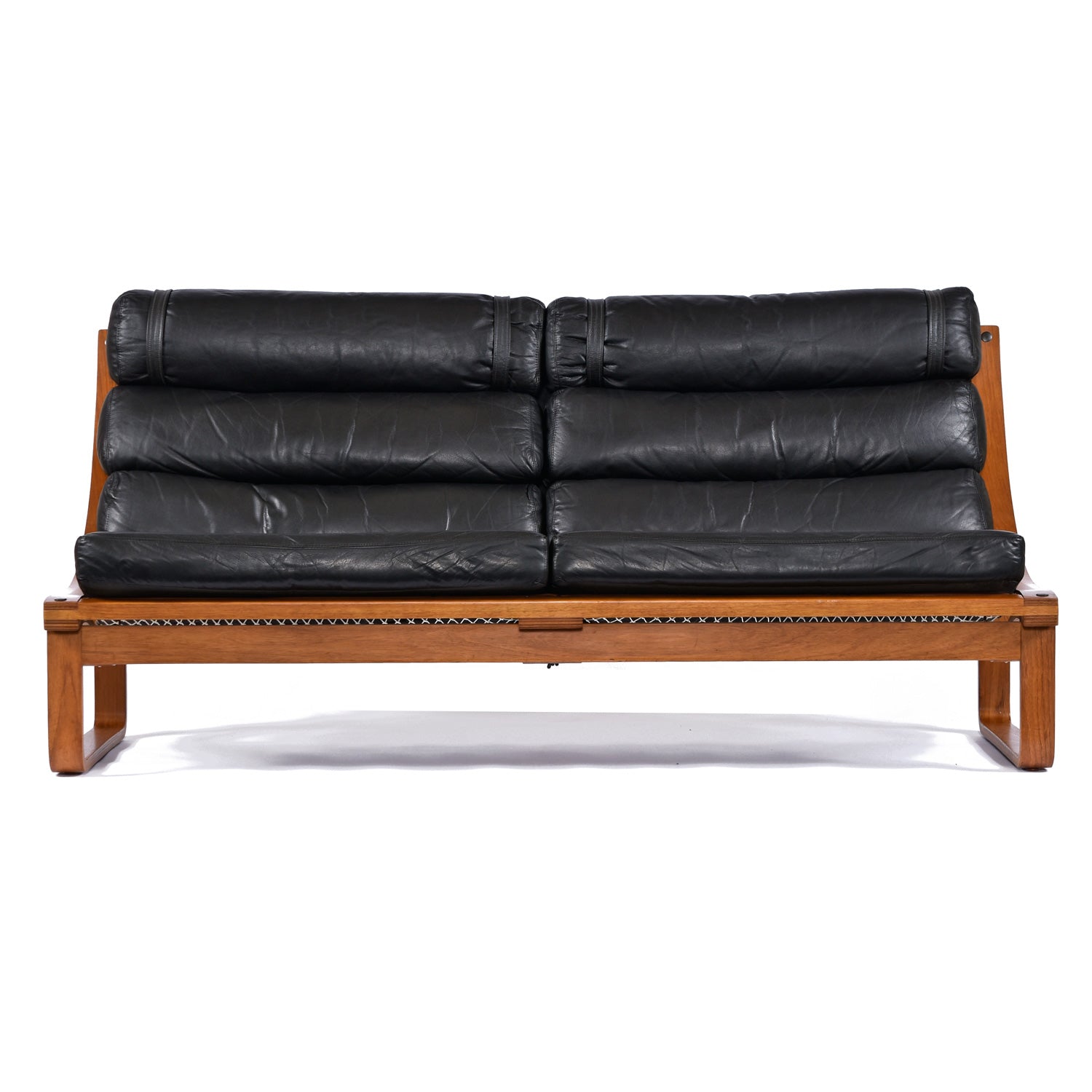 1970s Fred Lowen for Tessa Black Leather & Teak T4 Sling Sofa