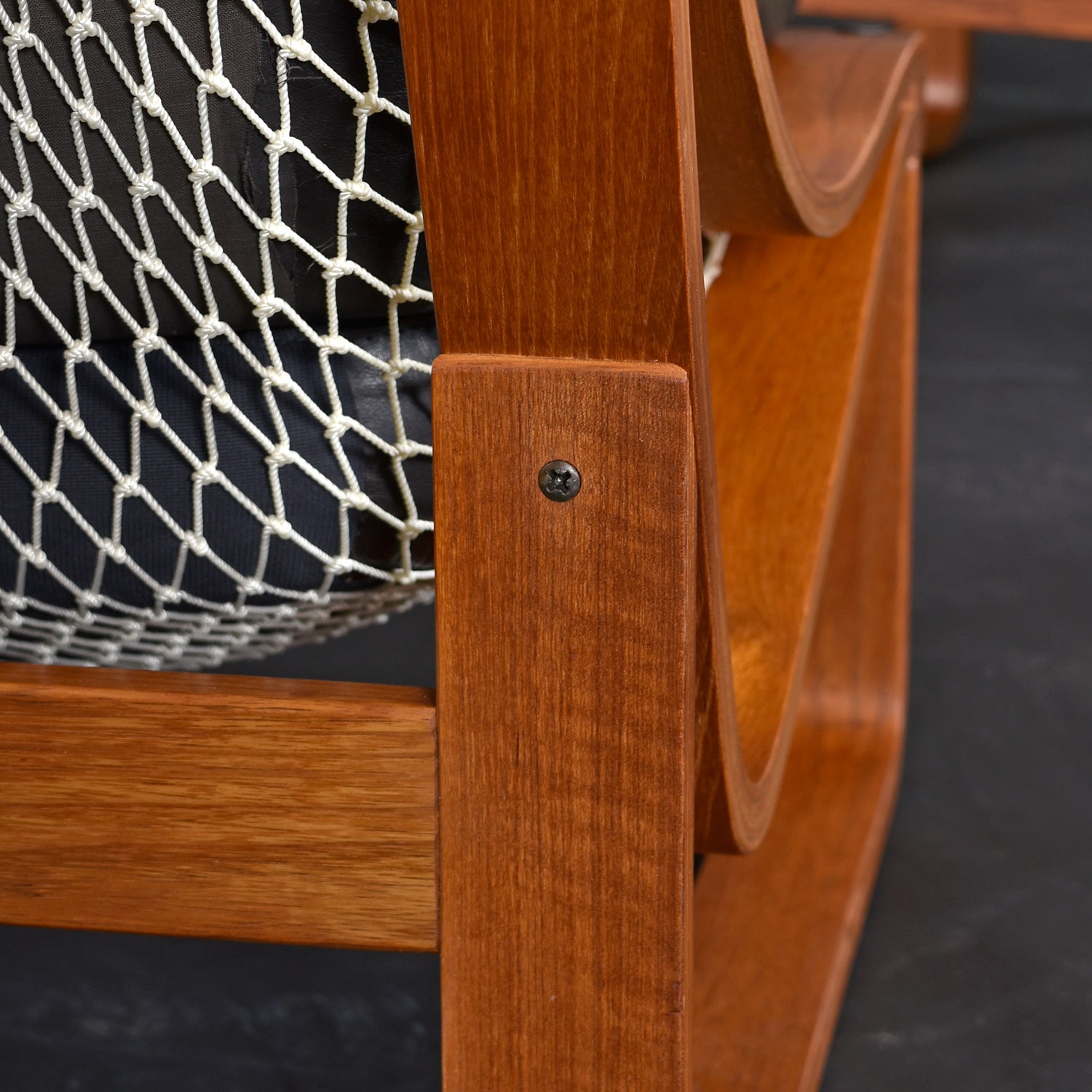 The hammock is like-new and provides all of the supportive capabilities it exhibited decades ago. This gently used sofa was clearly loved and pampered during it’s earlier life. Our restoration team, of course, spent many hours detailing every inch and mitigating most of the blemishes on the teak frame. Only very minor, age appropriate flaws remain on the teak. A few small sections of canvas on the (non-viewable) reverse side of the leather cushions have small gaps where the stitching came loose. We’ve had several 70s sofas over the years, and this T4 model is one of the most comfortable. The scoop style and high-back design cradles and supports the body all the way up to the head. The scoops allow your butt to sink down with a slight elevation of your legs. High enough for tall people to have head support, and low enough for short people to have their feet planted firmly on the floor.