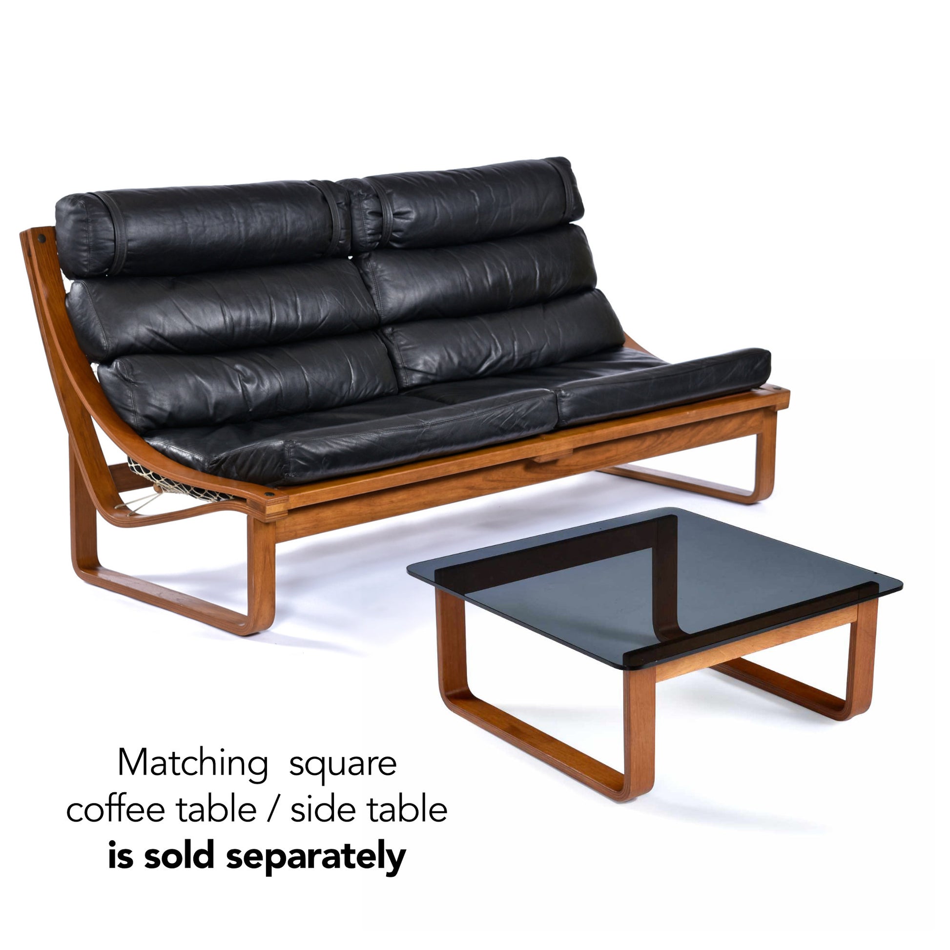 This listing is for the sofa alone. All the matching pieces have sold except the square table. Inquire if you are interested in purchasing the square table also (sold separately). Low profile meets high comfort without compromise with this T4 Sofa. This particular piece is an early 70s release, and is designed by Fred Lowen for Tessa Furniture. Curved, bent-ply teak rails are the ideal frame to suspend the gorgeous leather cushions in a cozy, netted rope hammock. Stunning from all angles and crafted from the finest materials. This sofa is in excellent original vintage condition and we’re certain you won’t find a more sublime representation anywhere (if you can even find one).