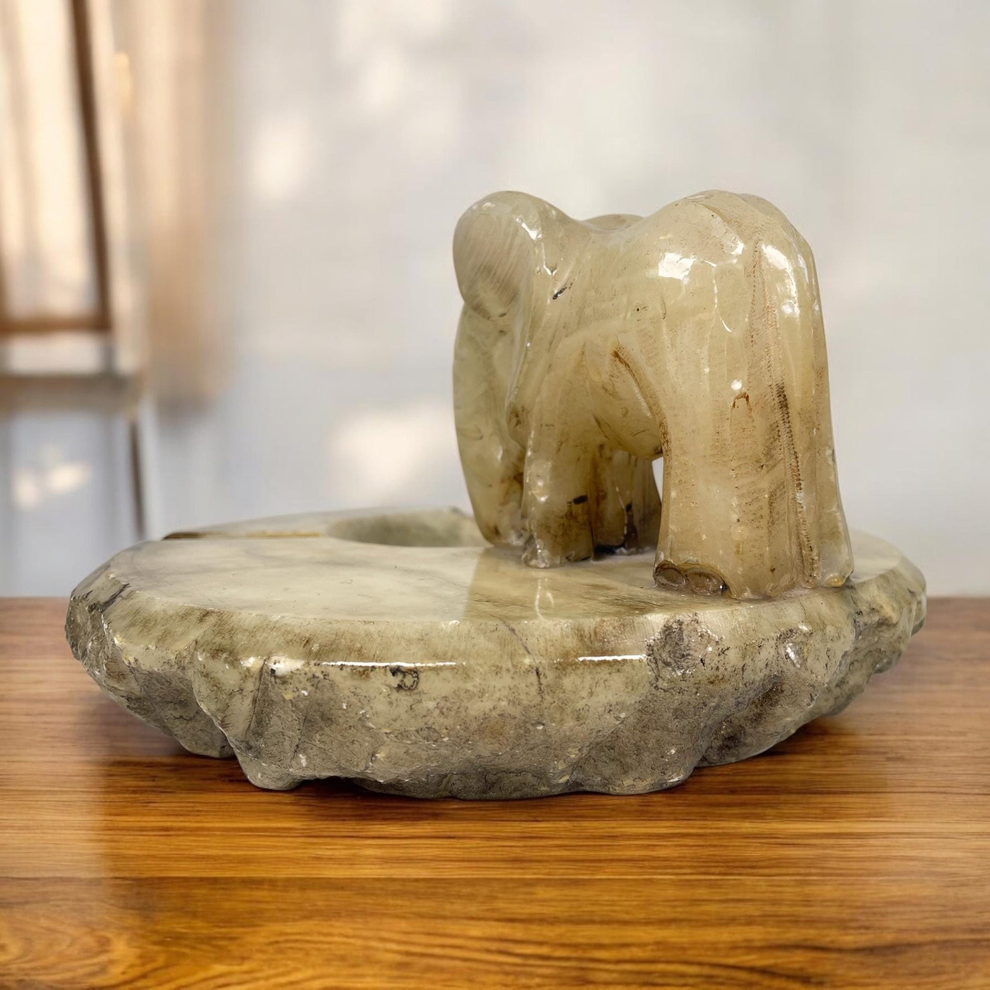 Add a touch of timeless charm to your space with this vintage alabaster ashtray, featuring a beautifully hand-carved elephant motif in an onyx-toned hue. This unique piece effortlessly combines functionality with artistic craftsmanship. The dish is carved from natural alabaster stone, showcasing organic veining and earthy tones of brown, beige, and amber, while the elephant figure stands proudly, offering an exotic accent reminiscent of old-world décor.