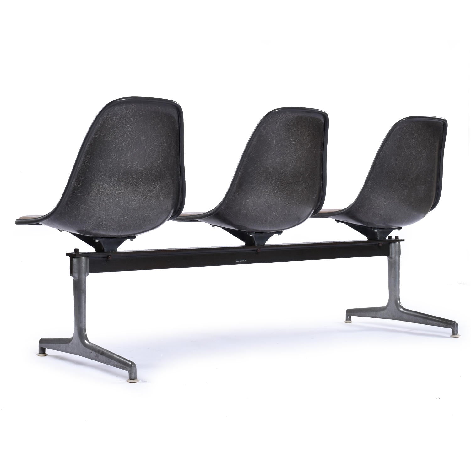 Vintage Charles Eames 3-seat tandem bench. The bench features original brown Naugahyde pads and dark charcoal gray fiberglass shells. Each chair features the Herman Miller insignia beneath the seat. The steel bar also has a Herman Miller sticker.