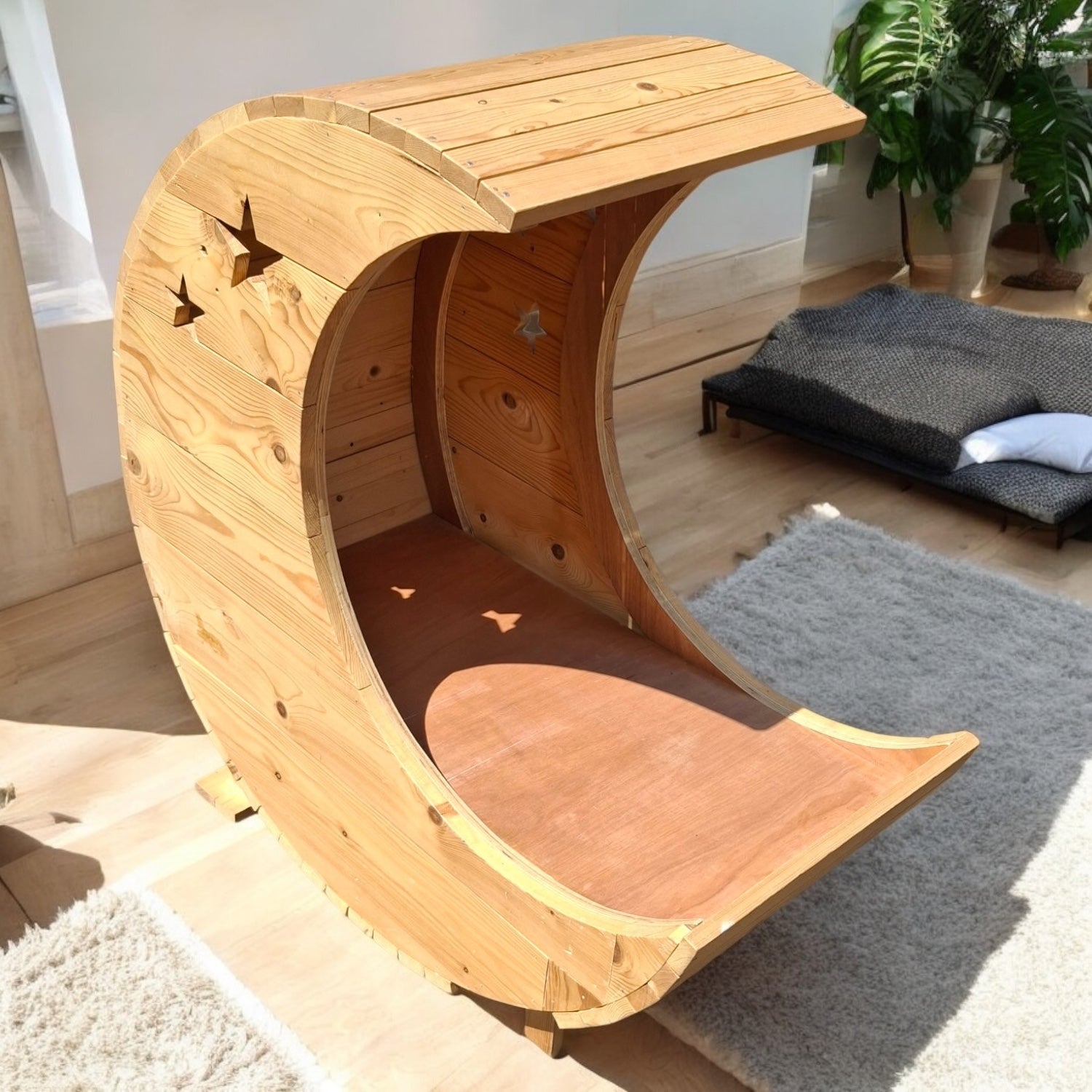 Op maat gemaakt, handgemaakt hondenbed in de vorm van een halve maan. Dit unieke bed zal uw geliefde hond zeker zoete dromen en een aangename nachtrust bezorgen.