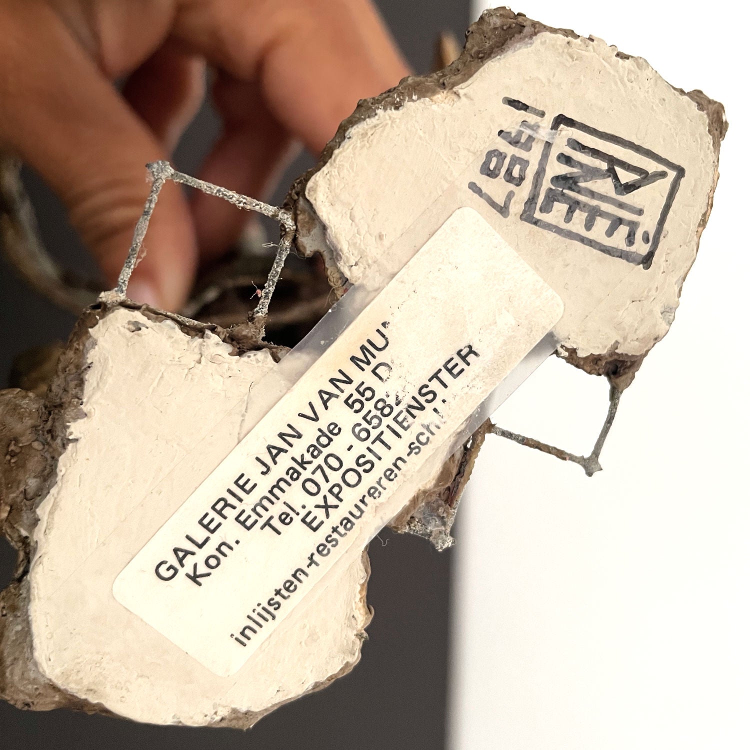 Delightfully spooky 1987 zombie sculpture from Den Haag galerie Jan Van Munster. Het Beeldje appears to be crafted from cloth or paper, laid over a wire macqette. The artist has finished his masterpiece with paint and glaze. Here the artist has truly captured the gruesome look of the zombie, while not making it look too grotesque. There is a label beneath the sculptuur stating the galerie name Jan Van Munster and production year, 1987. The artist has signed his name, but it is undecipherable.