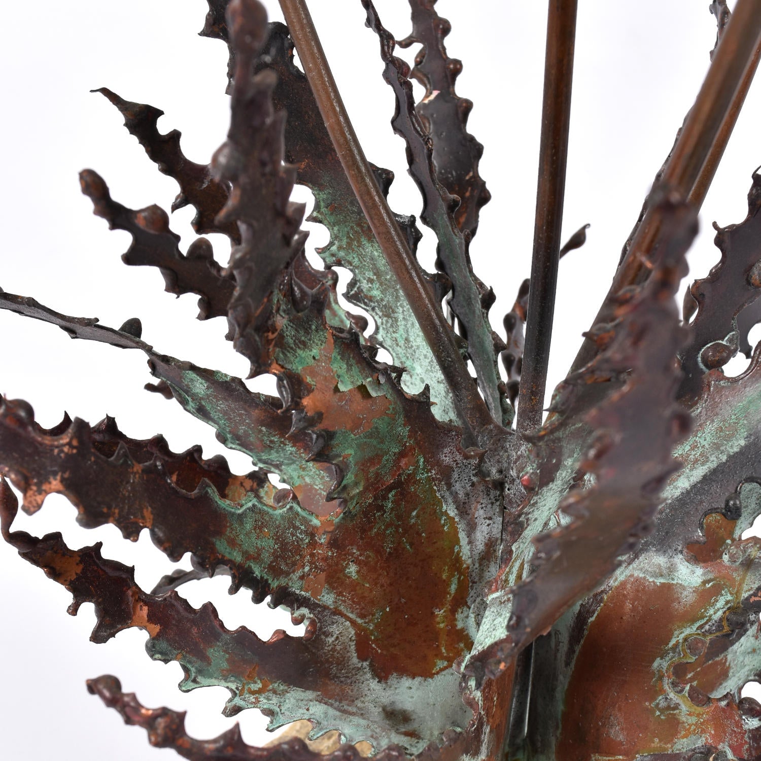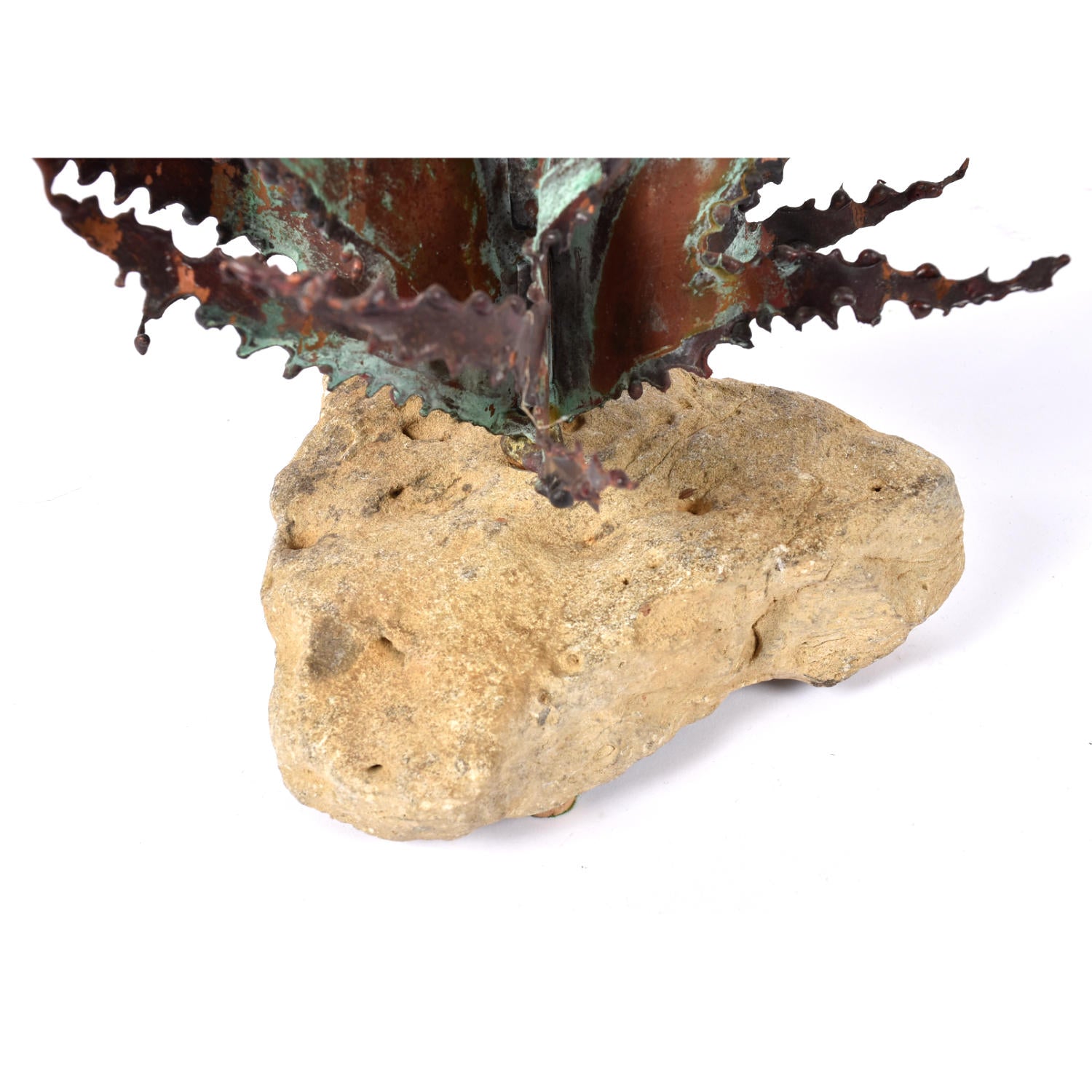 Vintage 1960s metal and stone table top sculpture. “Desert Rose” by John Steck is a timeless floral arrangement of bristly pom-pom blooms emanating from a stone base. The botanical aspects are all made of copper and brass. The flower heads are made of fine metal threads as ethereal as dandelion poofs. Heavily textured torch cut leaves are gathered around the base. The rustic look celebrates the material and medium as much as prominently as the subject. The Brutalist style the “brut” means raw… or unfinished. While other metal sculptures are finely finished and polished, Brutalism shows the artist’s process and unadulterated nature of the material. This Brutalist sculpture shows the appropriate patina.