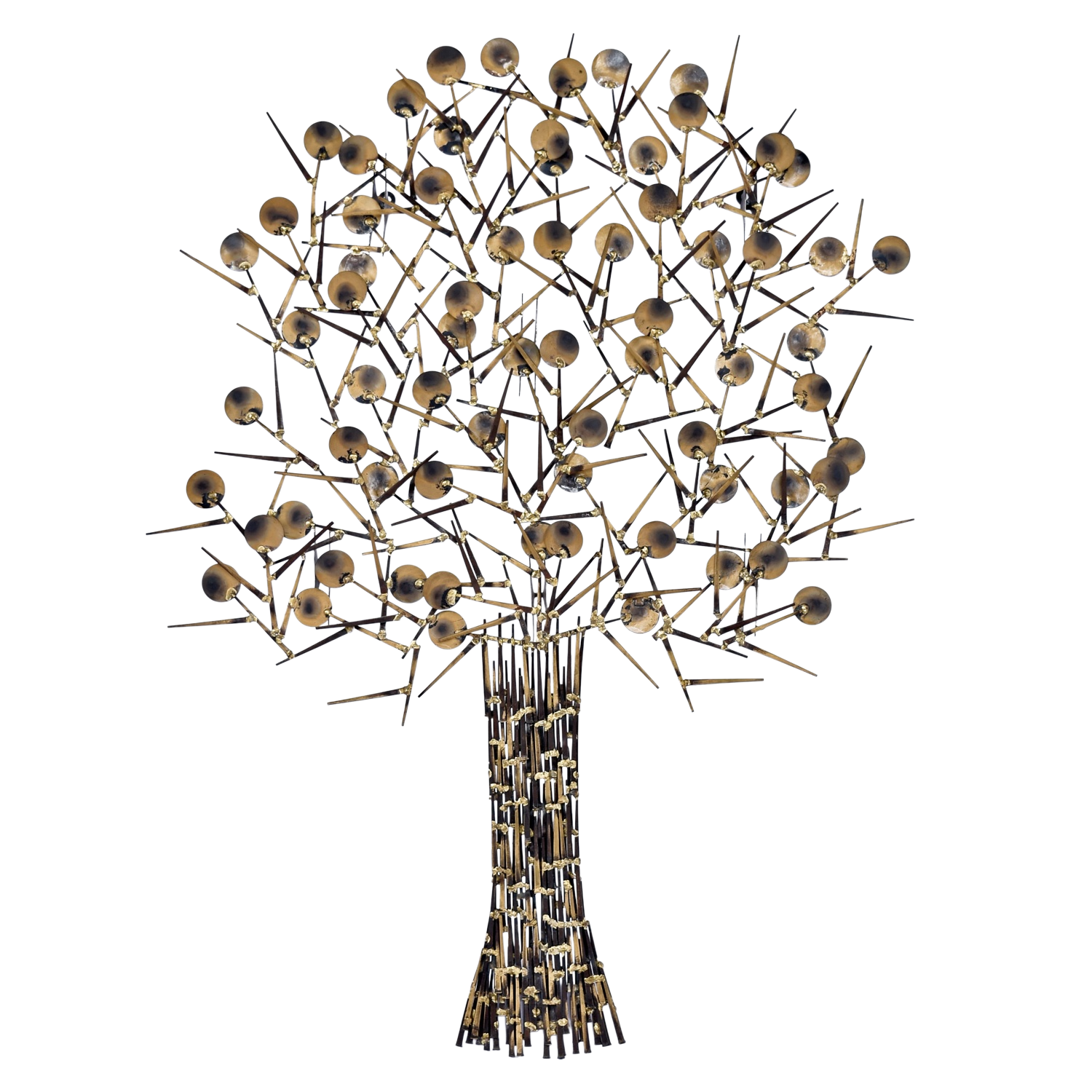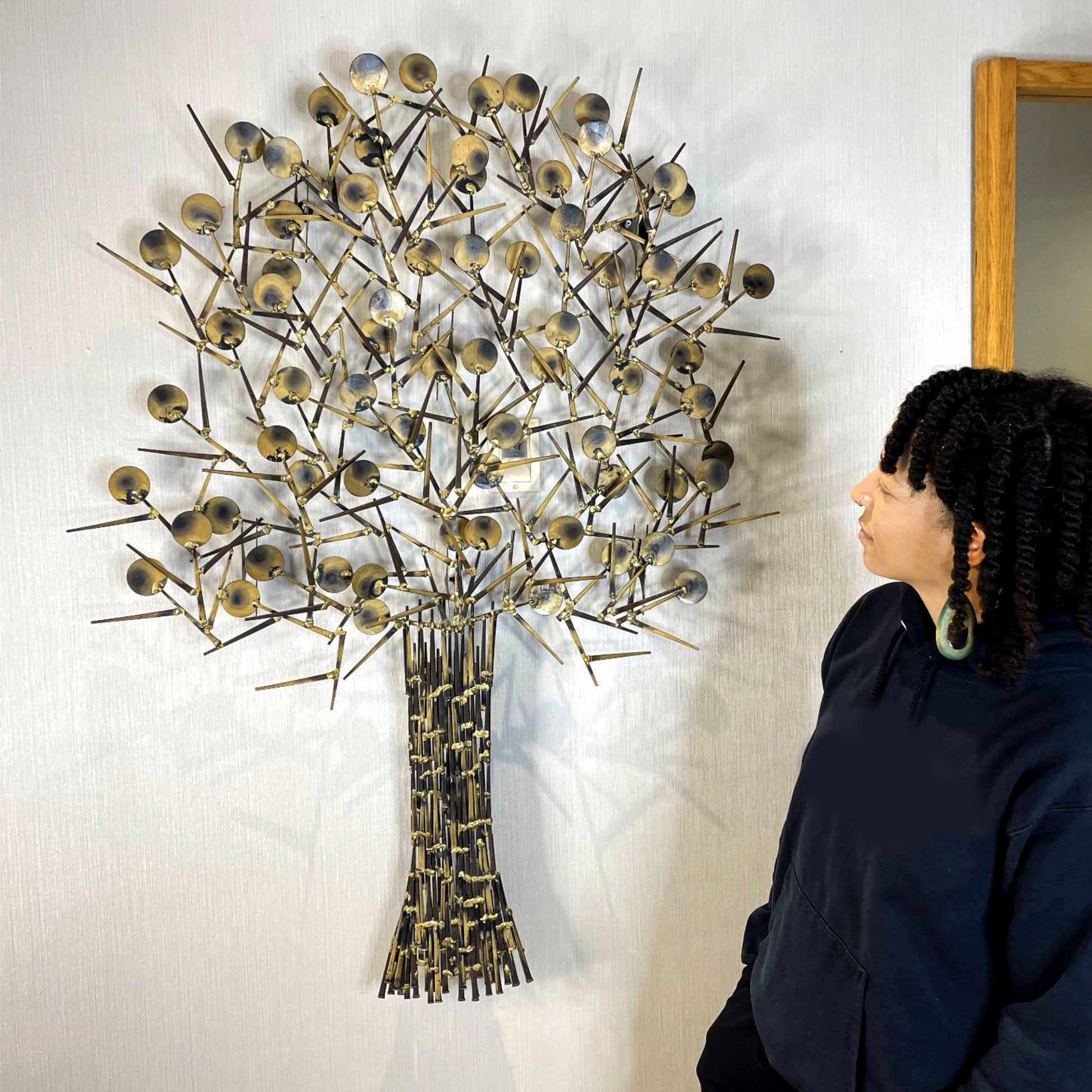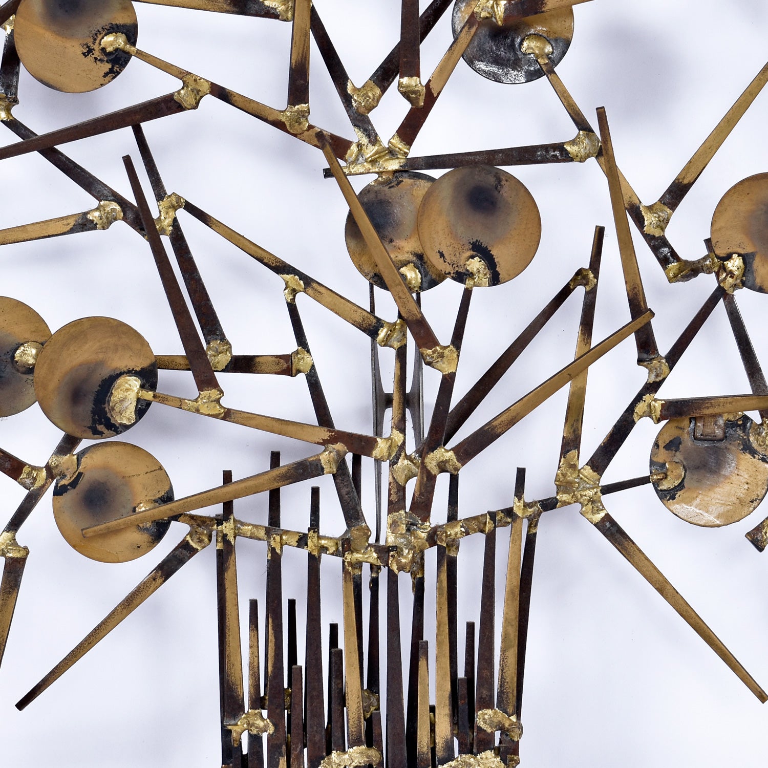 Designed by Marc Weinstein for Marc Creates, this massive 1970’s sculpture depicts a brutalist interpretation of a tree using large metal nails welded together. Highlighted with gold tones, the assemblage of brazed circular leaves / flowers evokes a calming contrast to the kinetic aggression of the tapered nails. The 49.25″ tall sculpture easily mounts to the wall, creating a captivating focal point. Oxygen and acetylene torches are extensively used to cut and connect metal under extreme heat in a process called manual brazing. This sculpture has hundreds of connections. Every part of the design is handled separately and discretely while creating the artwork. It’s a time consuming procedure that allows the opportunity to provide necessary attention to each individual component. Each hand made Marc Weinstein creation has a life and soul of its own. The sculpture has it’s original foil tag on the back.