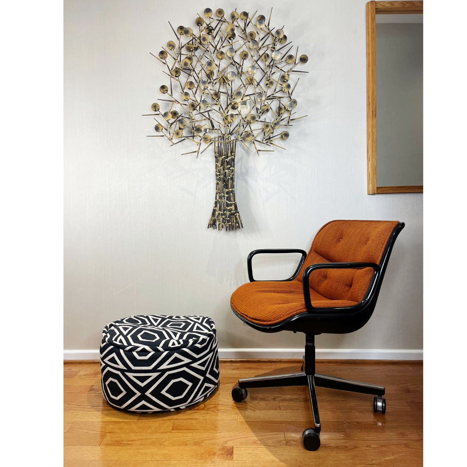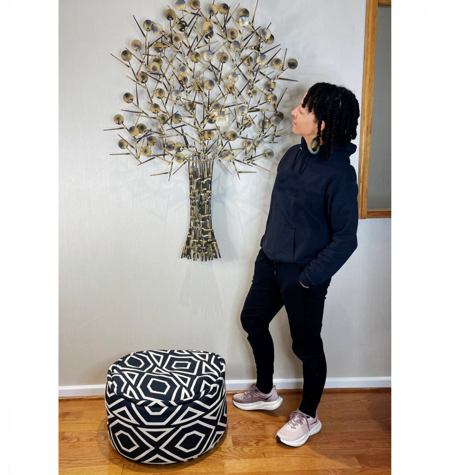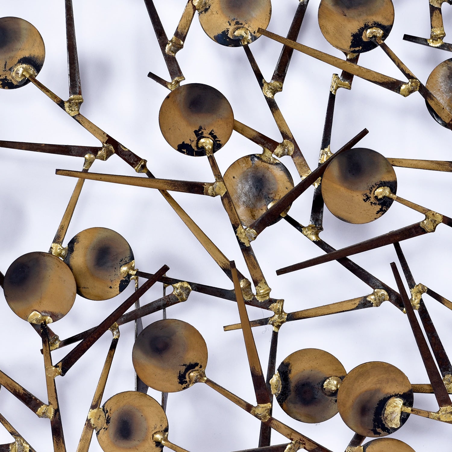 Designed by Marc Weinstein for Marc Creates, this massive 1970’s sculpture depicts a brutalist interpretation of a tree using large metal nails welded together. Highlighted with gold tones, the assemblage of brazed circular leaves / flowers evokes a calming contrast to the kinetic aggression of the tapered nails. The 49.25″ tall sculpture easily mounts to the wall, creating a captivating focal point. Oxygen and acetylene torches are extensively used to cut and connect metal under extreme heat in a process called manual brazing. This sculpture has hundreds of connections. Every part of the design is handled separately and discretely while creating the artwork. It’s a time consuming procedure that allows the opportunity to provide necessary attention to each individual component. Each hand made Marc Weinstein creation has a life and soul of its own. The sculpture has it’s original foil tag on the back.