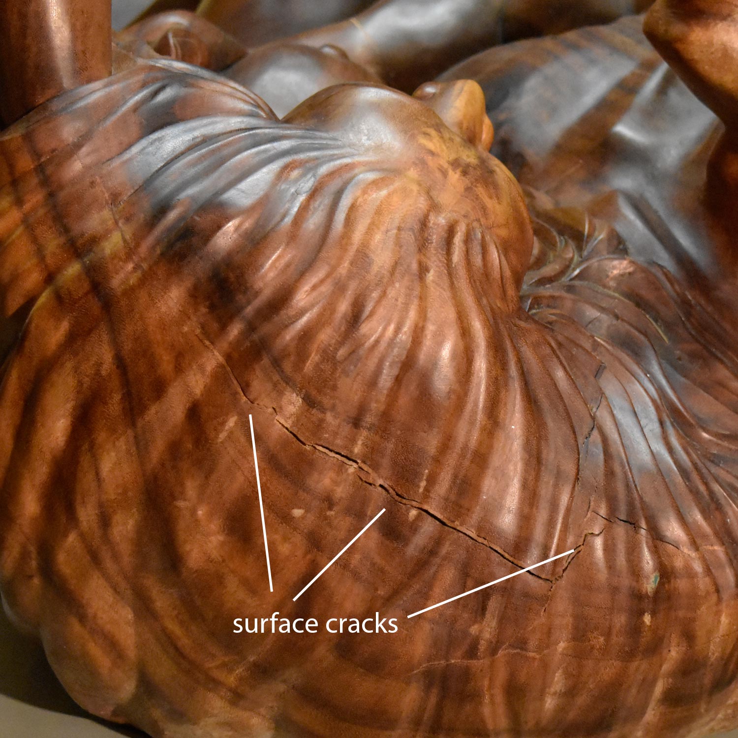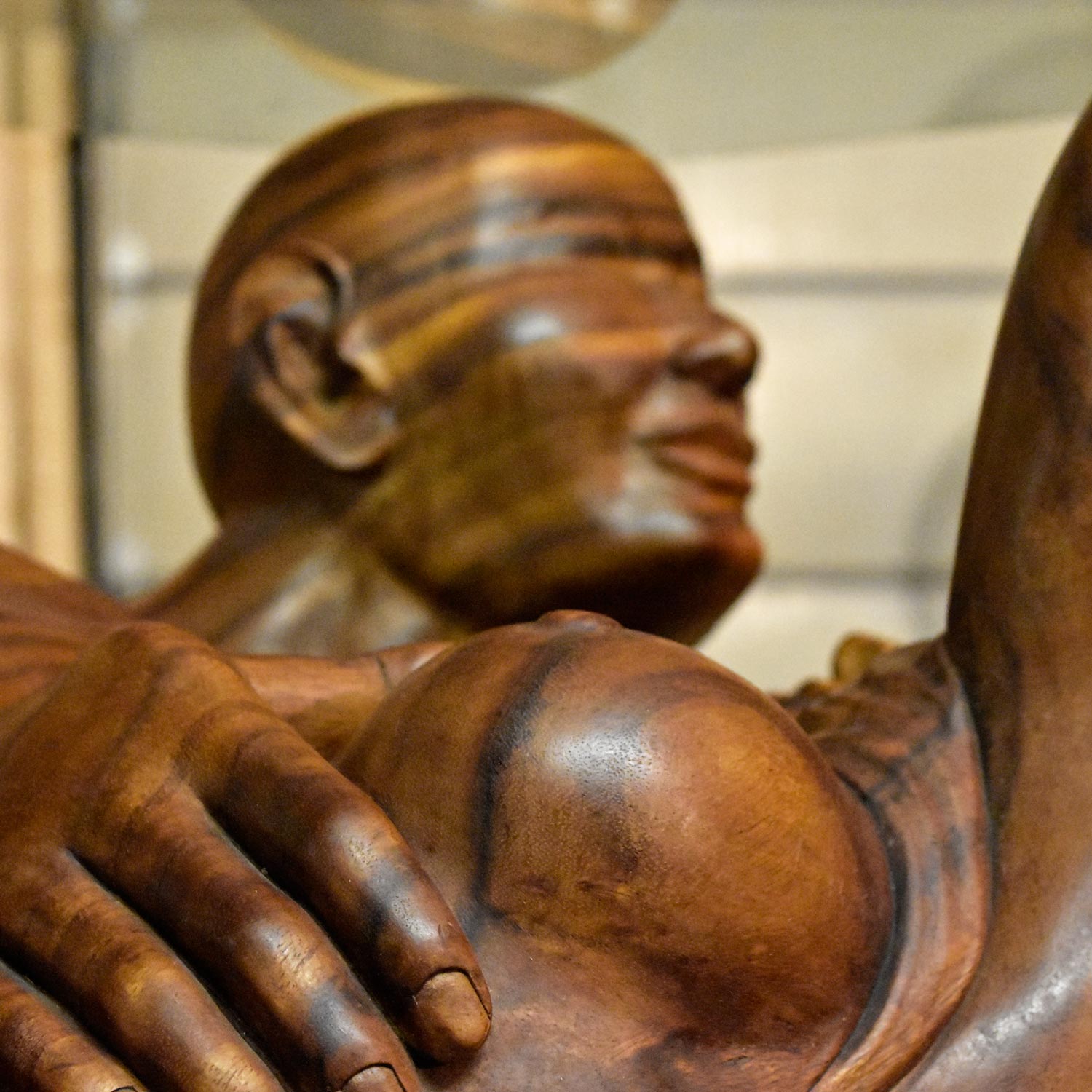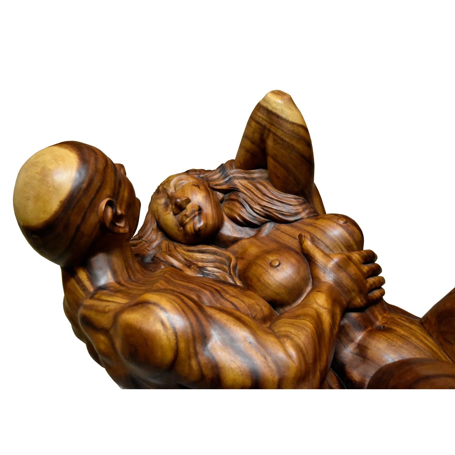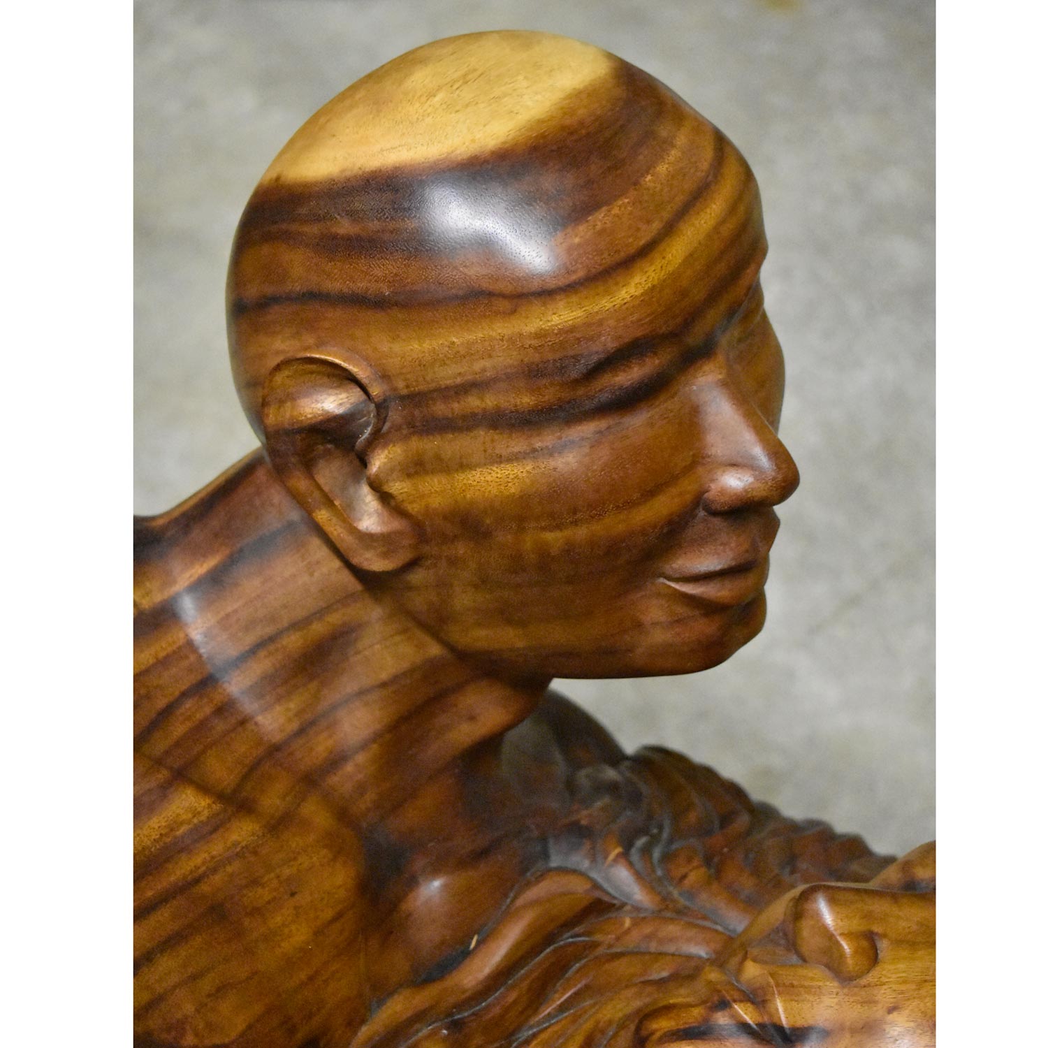 Two lovers entangled in an embrace that seems so detailed and authentic that the subjects seem as though they were real people turned into hardwood by a shaman. For example, the muscles on the male subjects back are rippled and two knots in the wood somehow situated themselves in the middle of each shoulder blade with concentric circles waving out from the center.