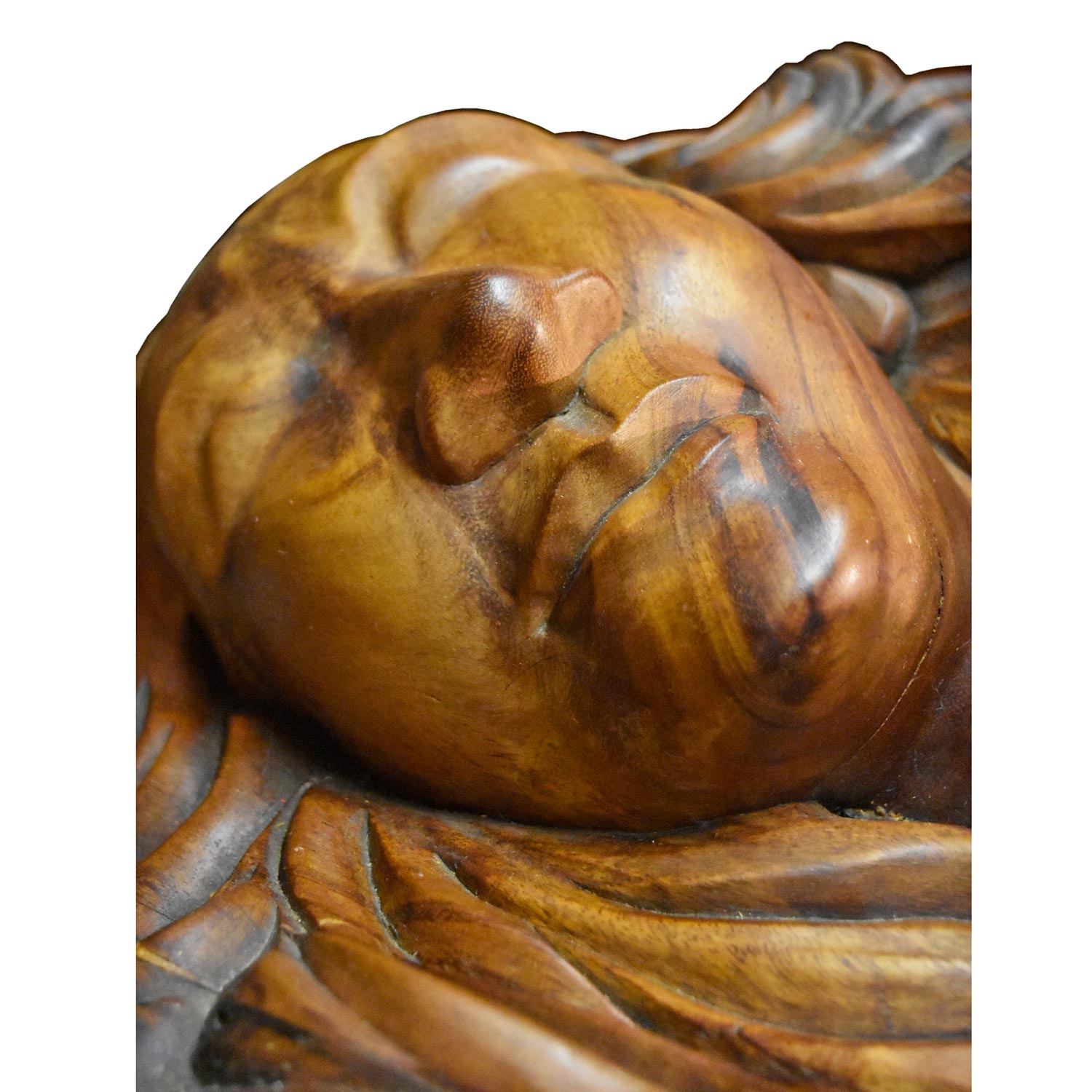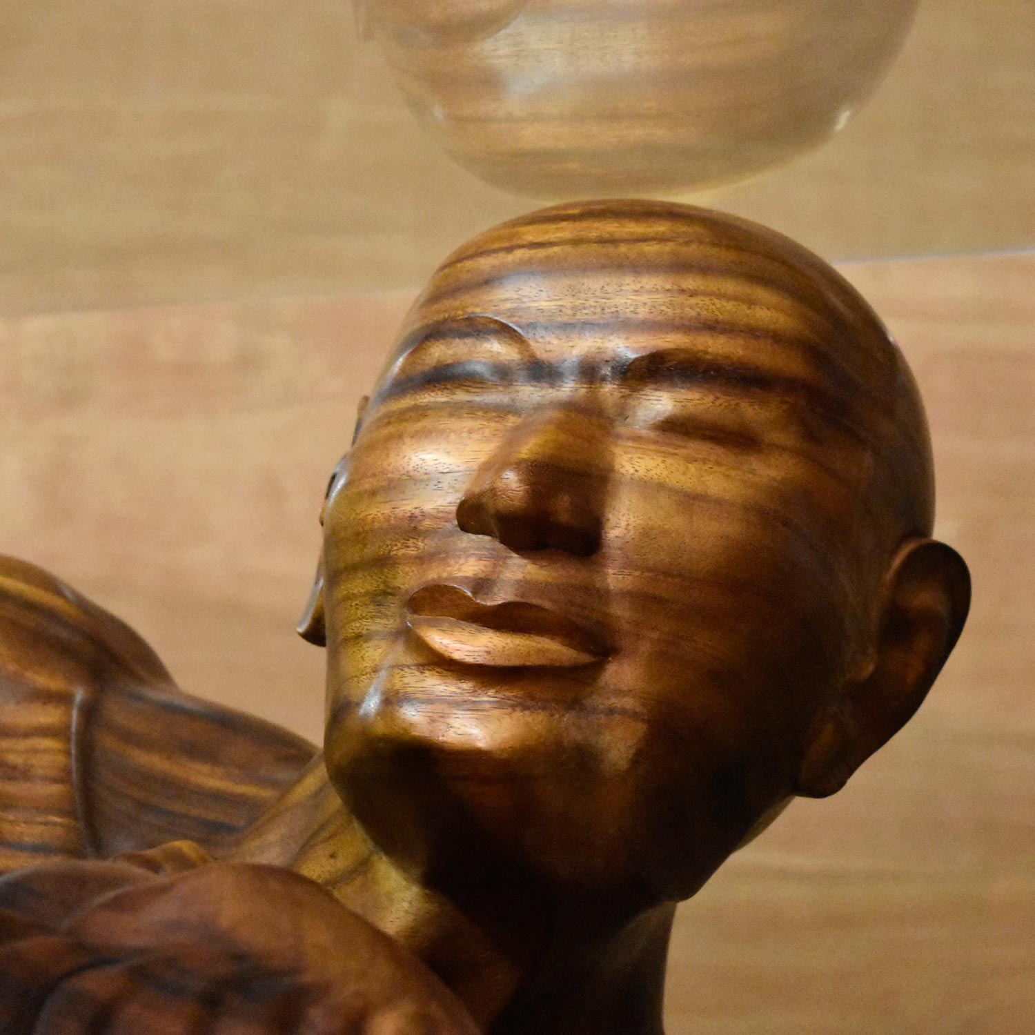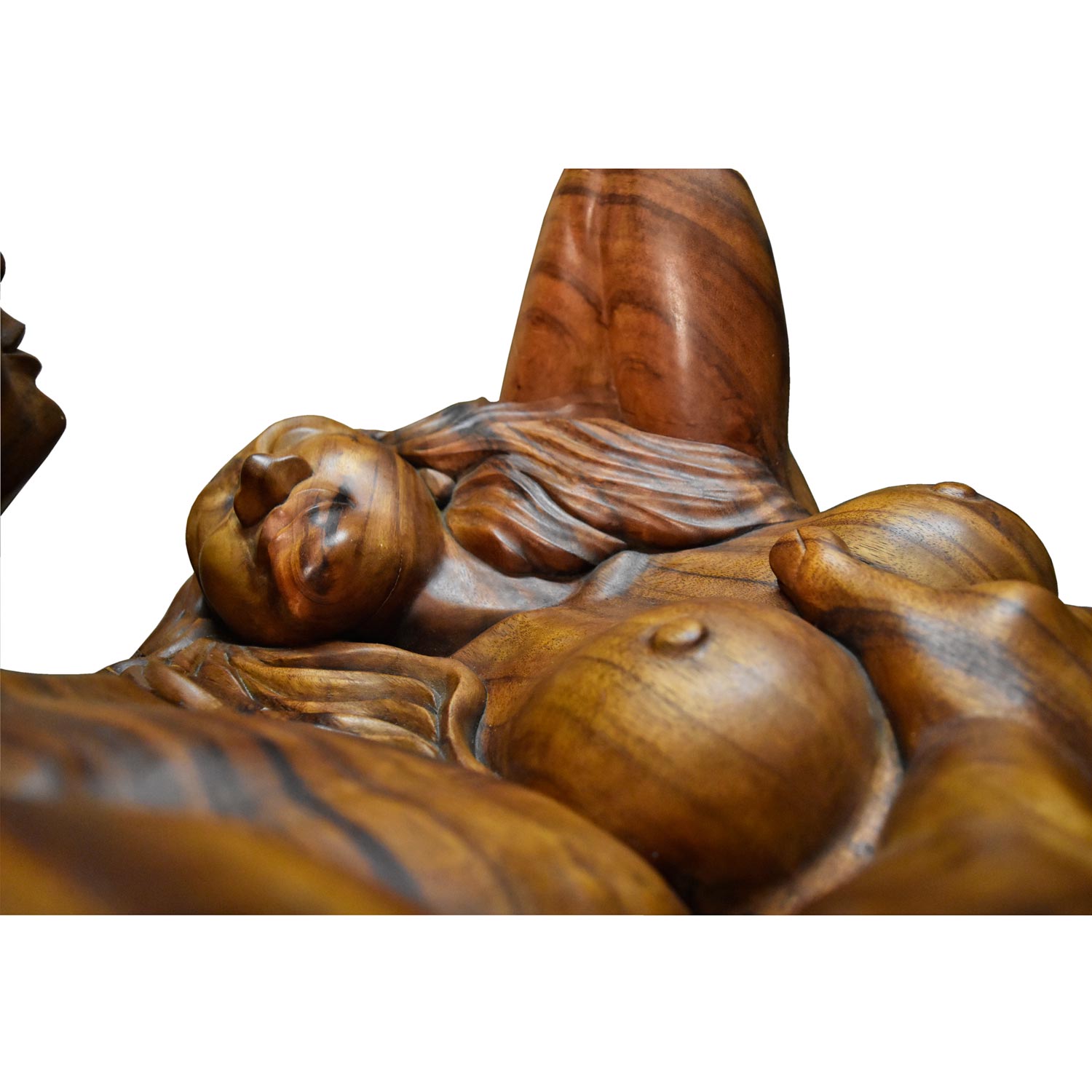 Masterfully hand carved from what must have been a colossal solid piece of monkey pod hardwood. This nude figural sculpture weighs around 250 lbs. Although our photos are an adequate representation, the authentic real life presentation of this work of art is truly jaw dropping.