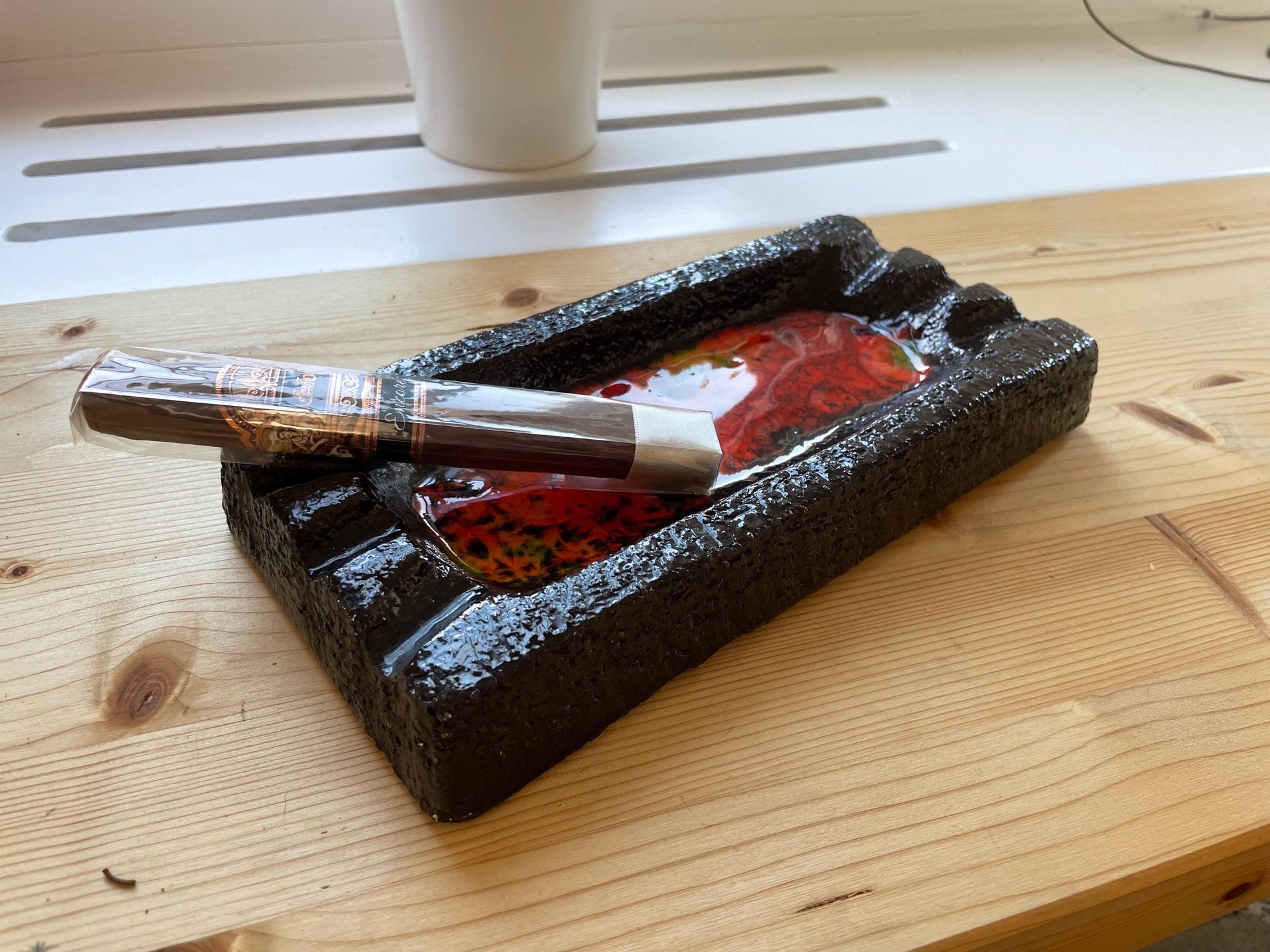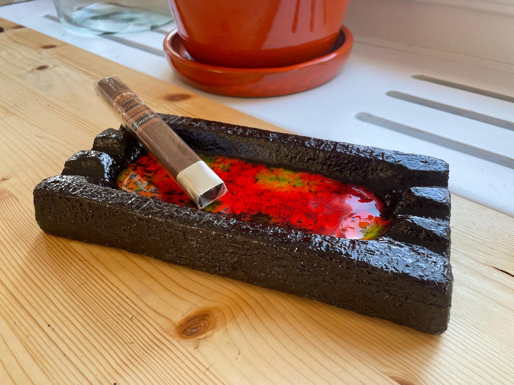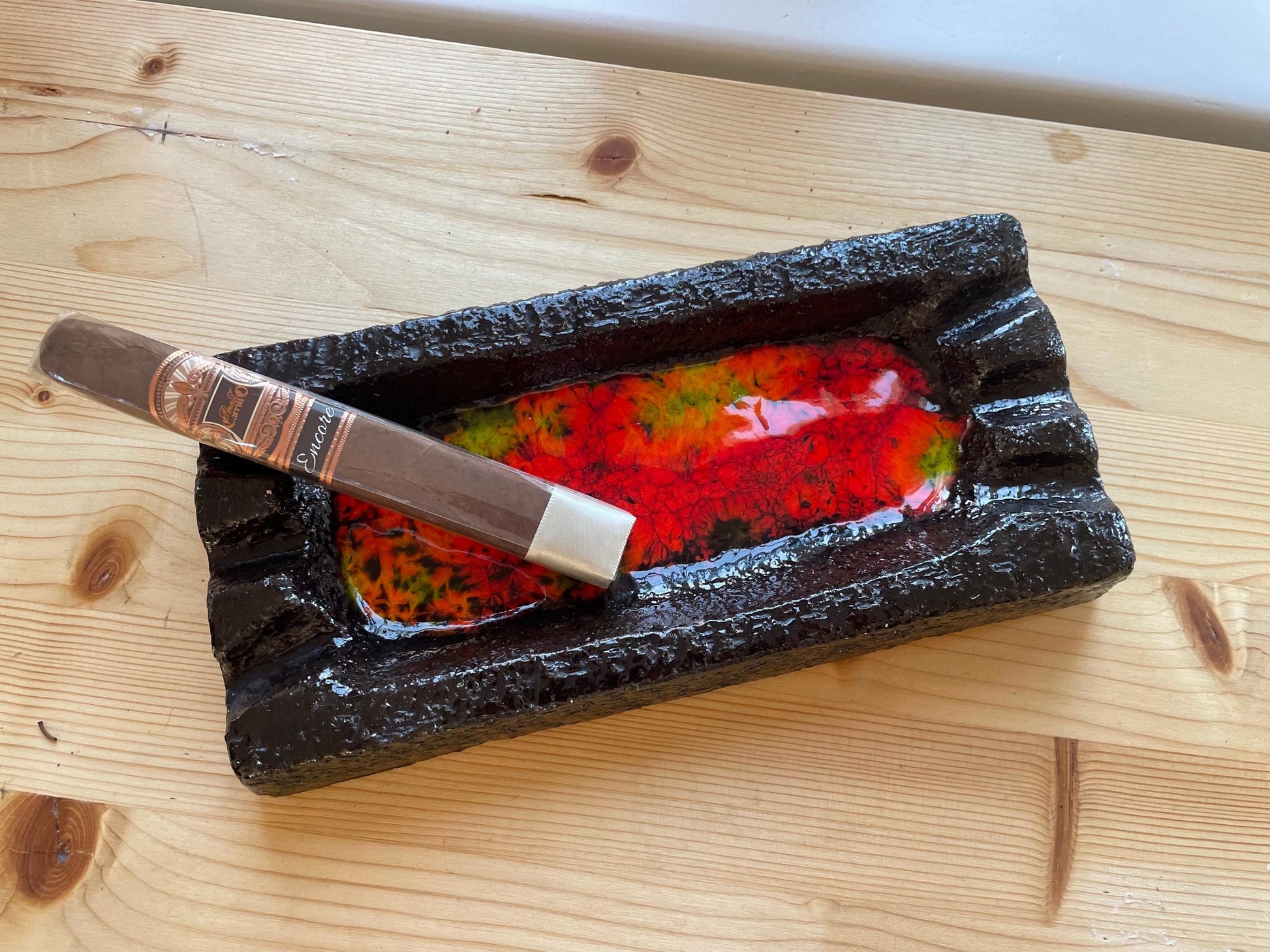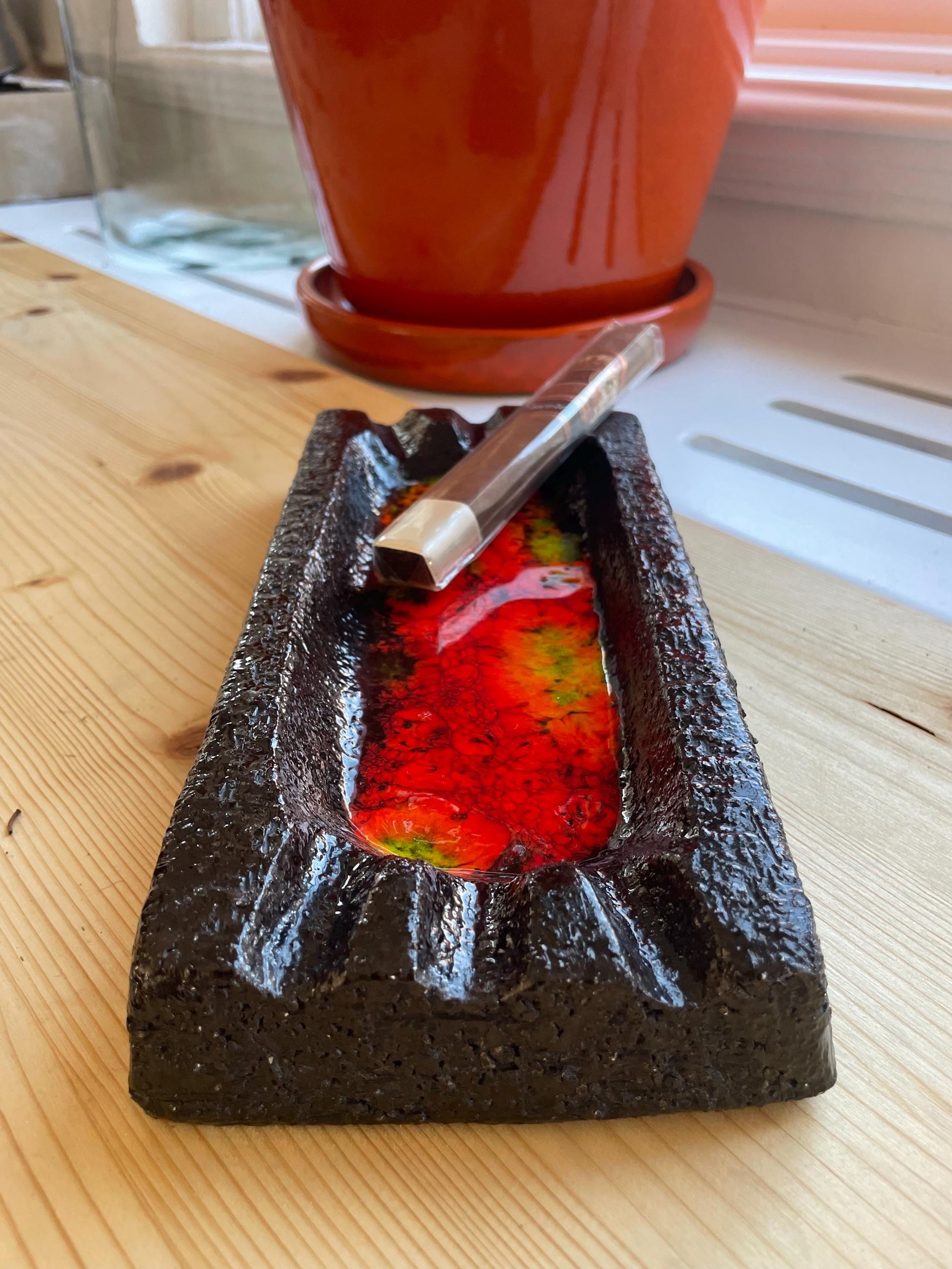 The rectangular form with grooved rests on each side adds both functionality and artistic flair, making it perfect as a display piece or collector’s item. Van Erp’s work is highly sought after for its distinctive texture and bold color contrasts, and this ashtray is no exception. Its rich, volcanic-inspired glazing and mid-century modern aesthetic make it a standout item for any retro or design-savvy interior.