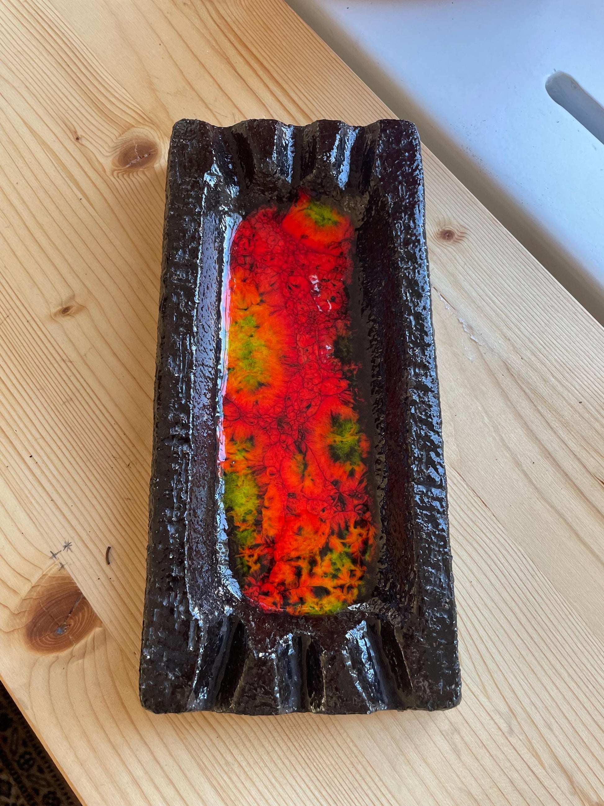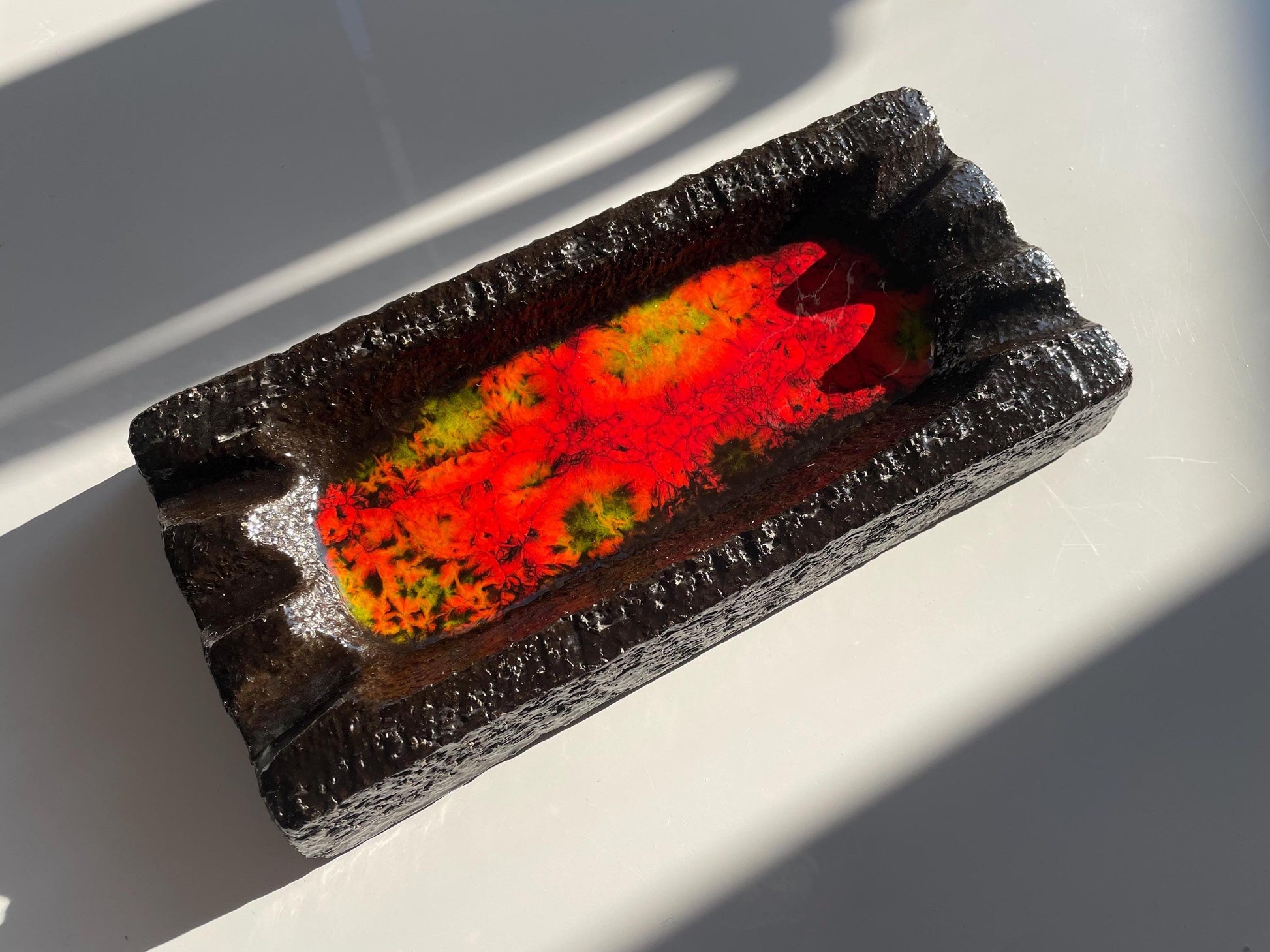This striking vintage ashtray is a bold example of the iconic “Fat Lava” style, created by renowned Dutch ceramicist Jan van Erp. Crafted in the mid-20th century, the piece features a rugged, tactile black glaze typical of Fat Lava ceramics, paired with a vivid, high-gloss red and orange lava glaze pool in the center, accented by bursts of yellow and green.