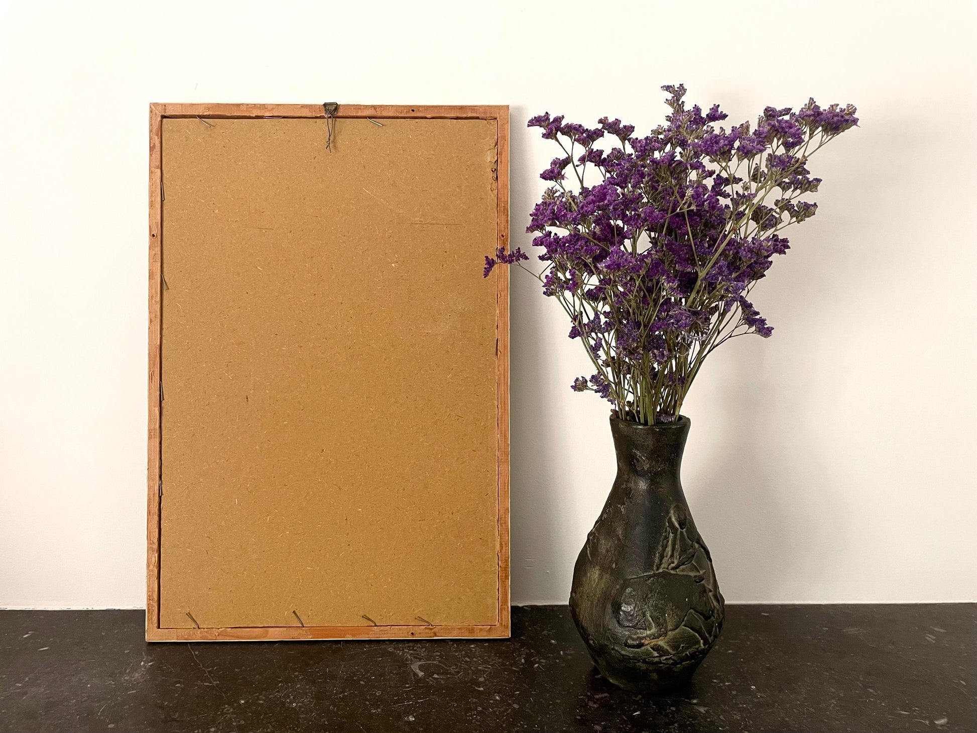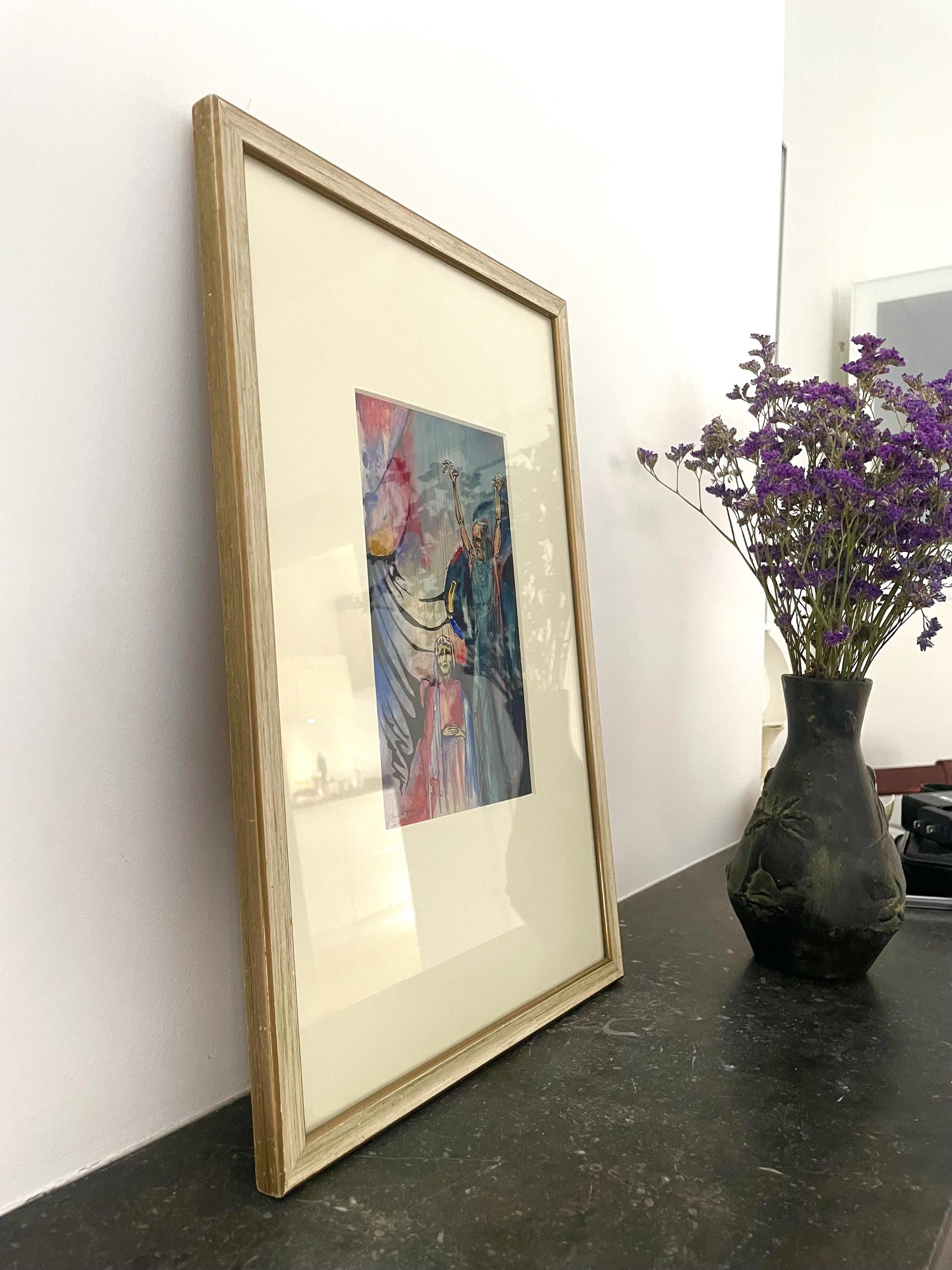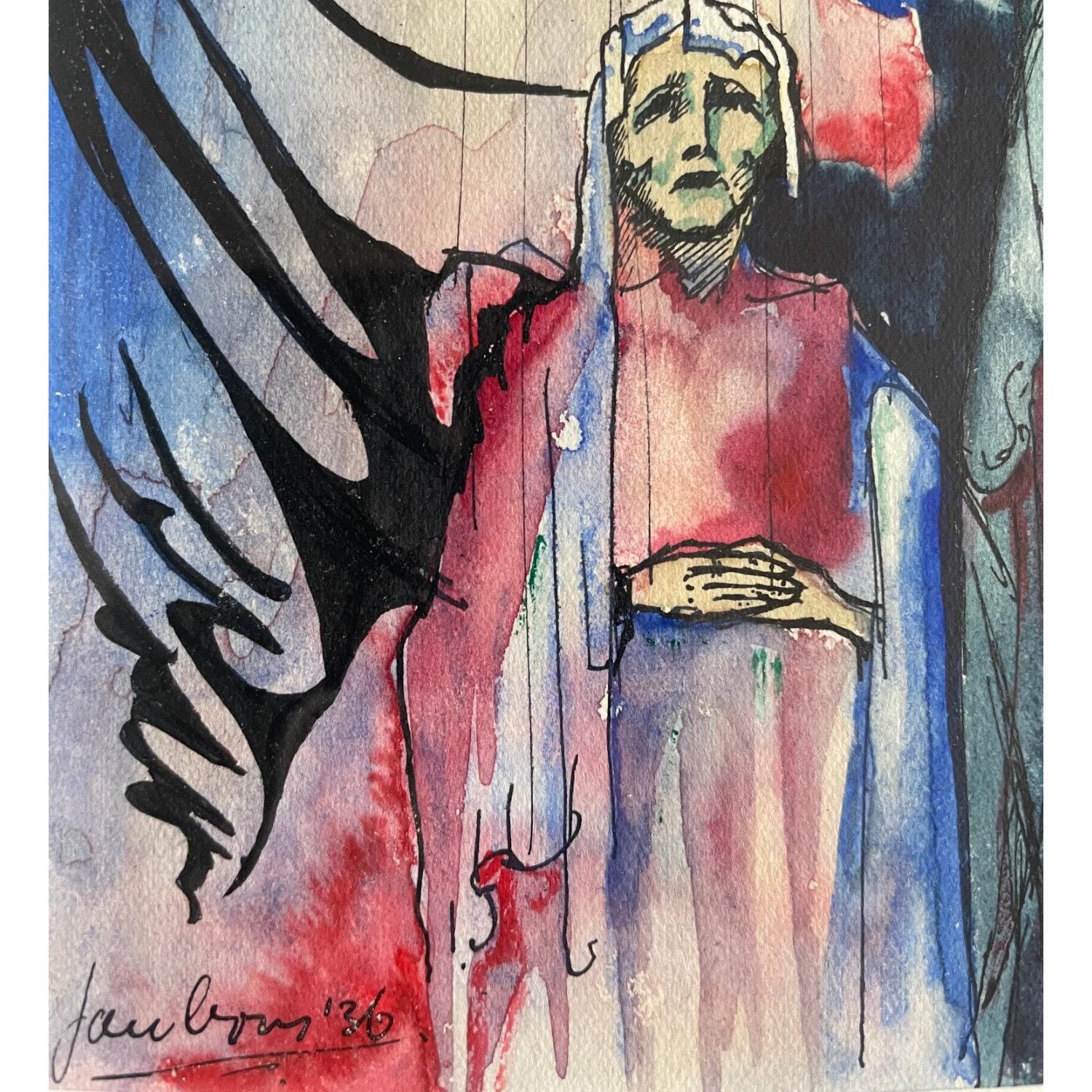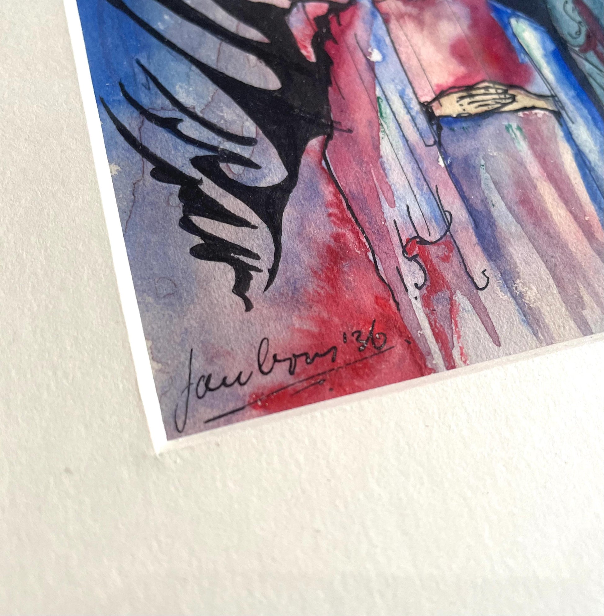 Executed in ink with either watercolor or ink wash, on paper. The painting’s line work and brush strokes are fervent, physically representing emotional discord. The artist’s use of light and shadow adds to the foreboding atmosphere, while the vibrant reds and deep blues provide a dynamic contrast. This piece is signed and dated “36” in the lower left corner (1936). The artist's signature is difficult to decipher. It appears to read "Jan Bous" - but that is unconfirmed. The piece is housed in a wood frame with a protective clear acrylic panel over the art.