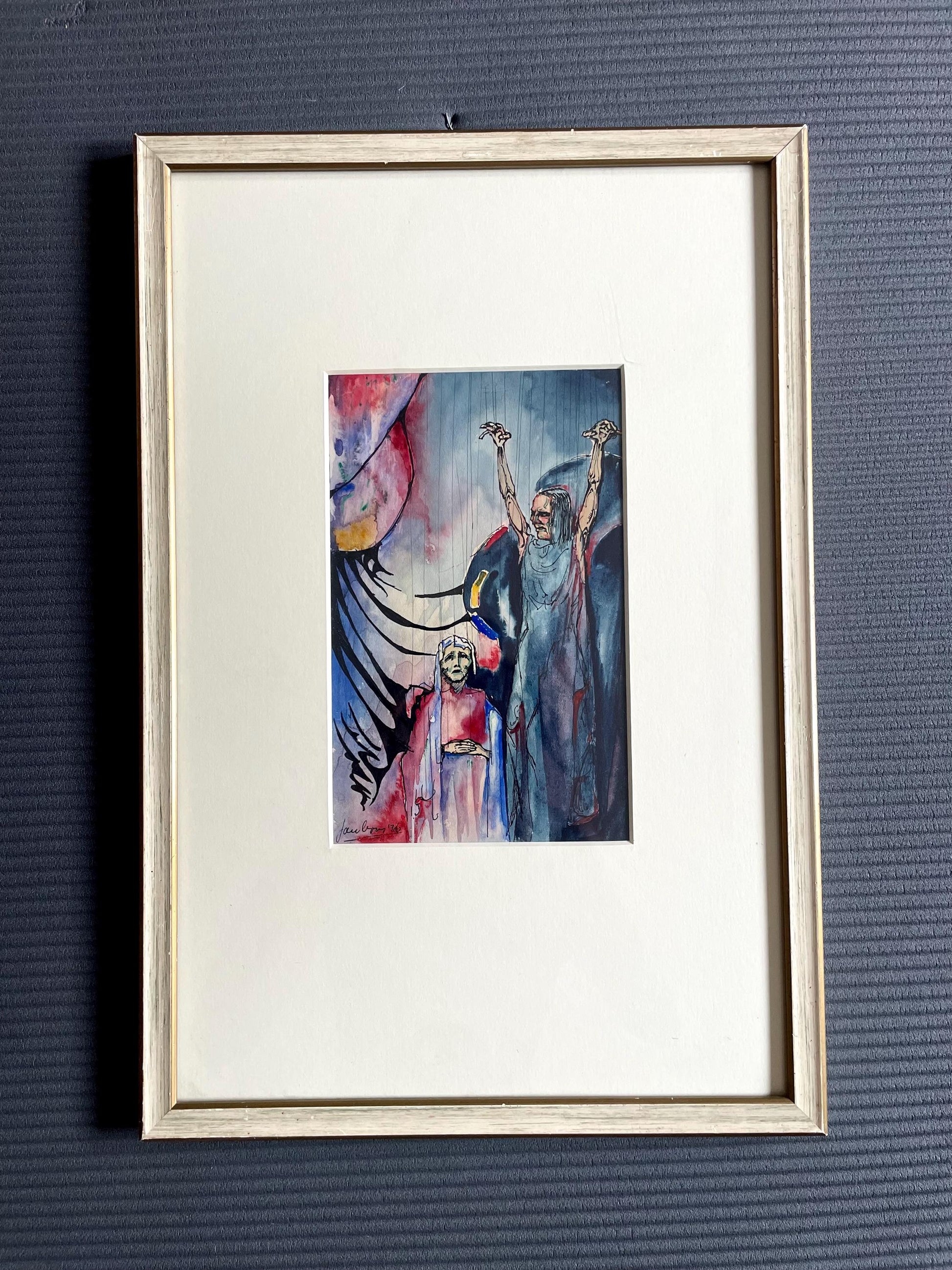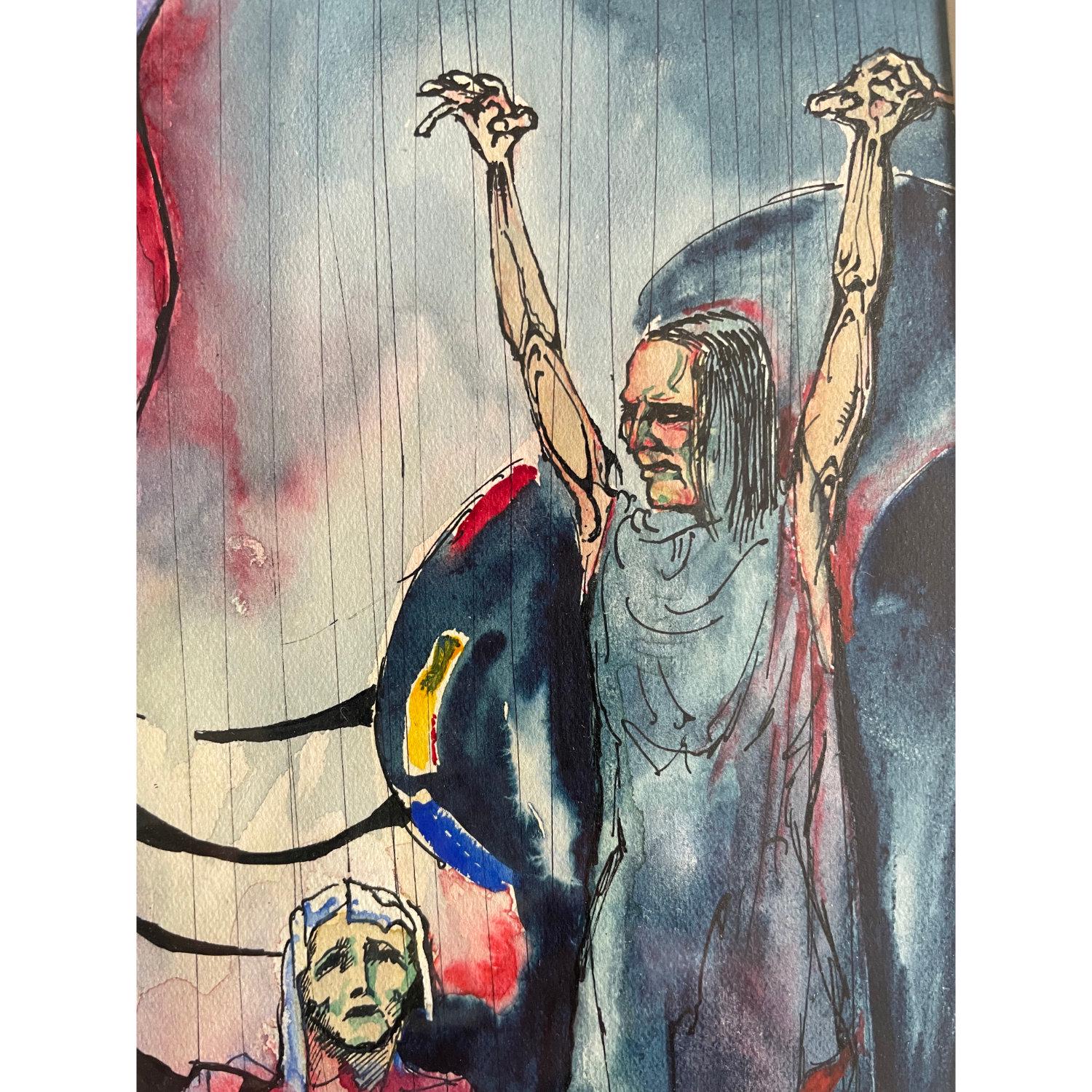 Immerse yourself in this evocative original painting that exploring the power of despair and transformation. Rendered in a dramatic Expressionist style, this work is both visually intense and symbolically layered. A commanding figure with raised arms dominates the composition, suggesting invocation, resistance, or surrender. Below, a smaller, cloaked figure stands in stark contrast—stoic and resigned. Surrounding both is mystical swirl of black wing-like forms and surreal color washes that evoke chaos and entrapment.