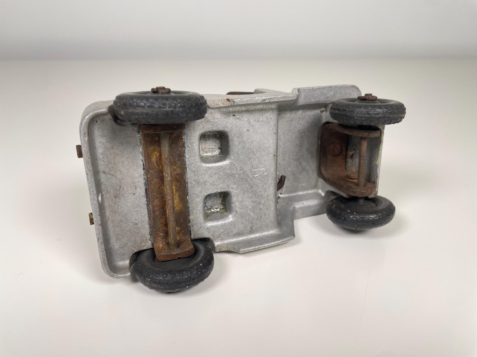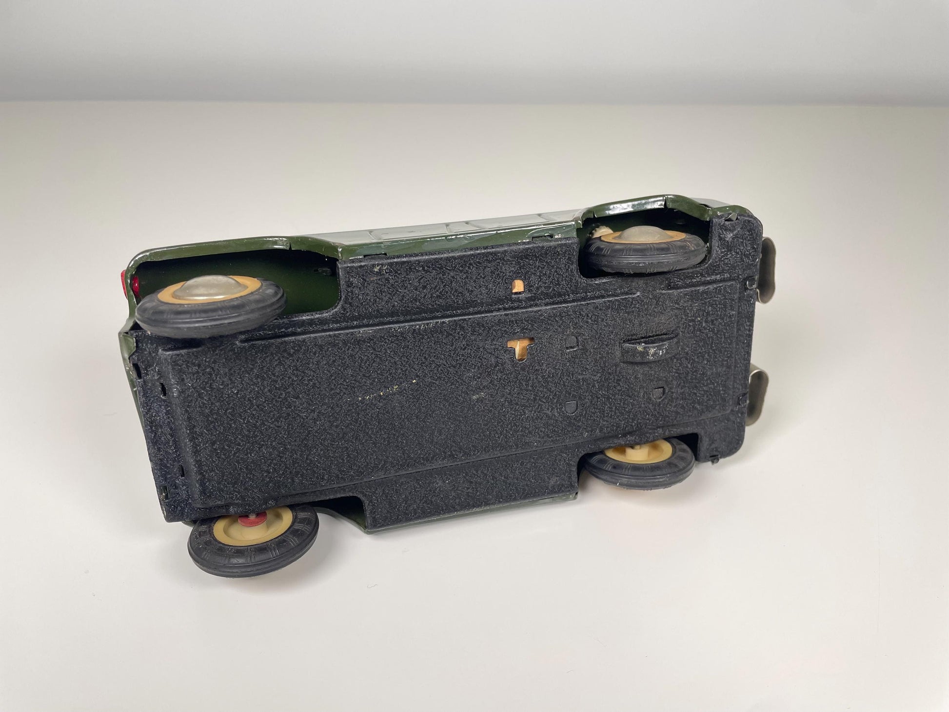 Pair of vintage Jeeps. The green one is a 1960s Open Air Car. The smaller, cast aluminum Jeep is dated from 1940s. Both made of metal.
