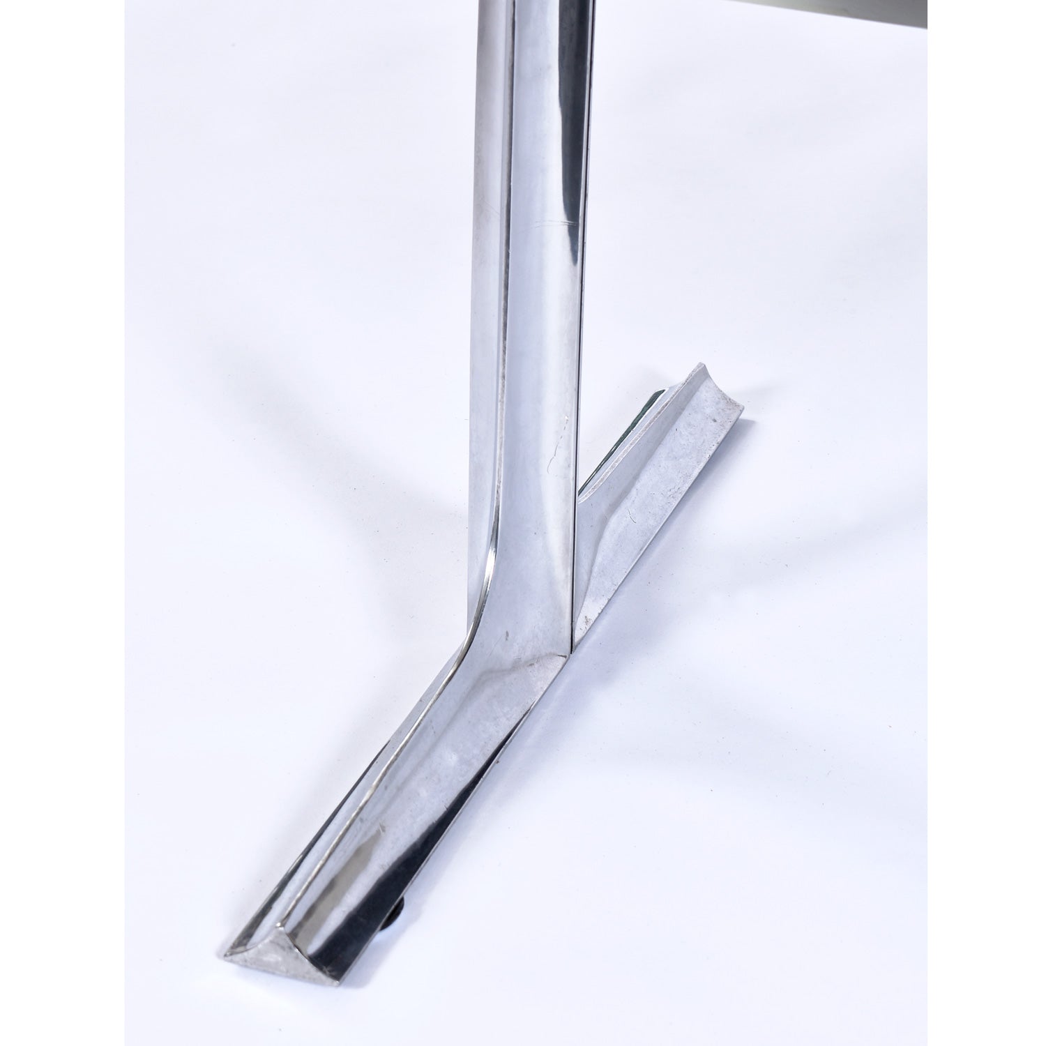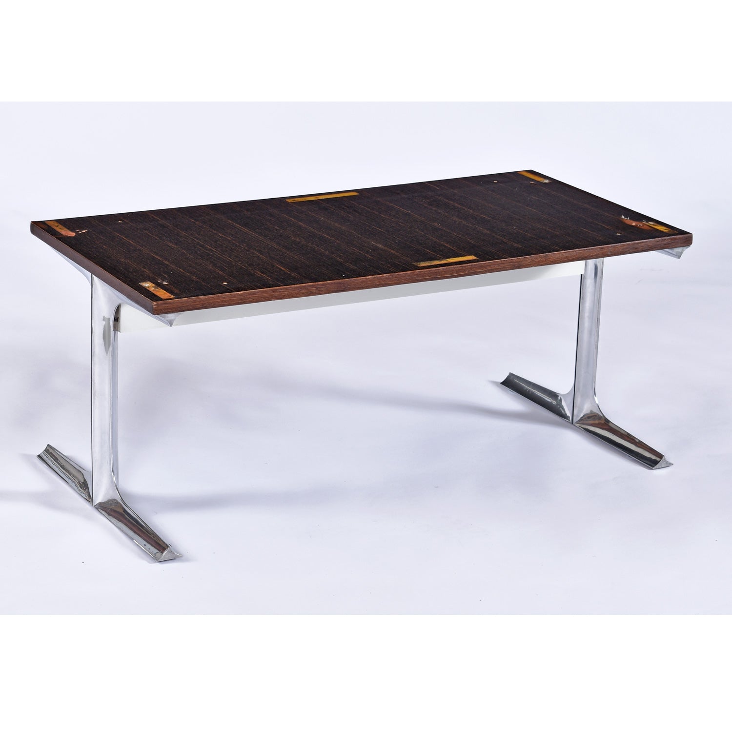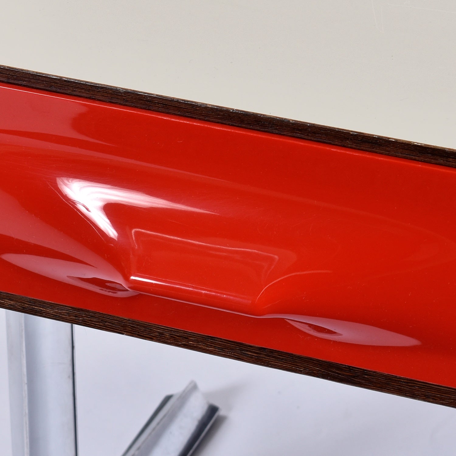 The restoration team pulled no punches on this authentic Raymond Loewy DF-2000 mini-credenza console, and the end result exceeded our expectations. We re-finished the rosewood on both front and back to accentuate the contrast between all of the diverse materials that make up this unit. As you can see, this console is fully finished in rosewood on the back and attractive from every direction. The bottom spanner was re-painted white and the cherry red, injection molded plastic drawer fronts were finally buffed and polished to a glassy shine. The top section drawer cabinet is separate from the base, and can be lifted off and screwed in place if desired. The bottom is a rosewood platform with polished chrome legs attached underneath. No need to worry about water marks and scratches with this top. The industrial strength laminate is ideal for TV and stereo components.