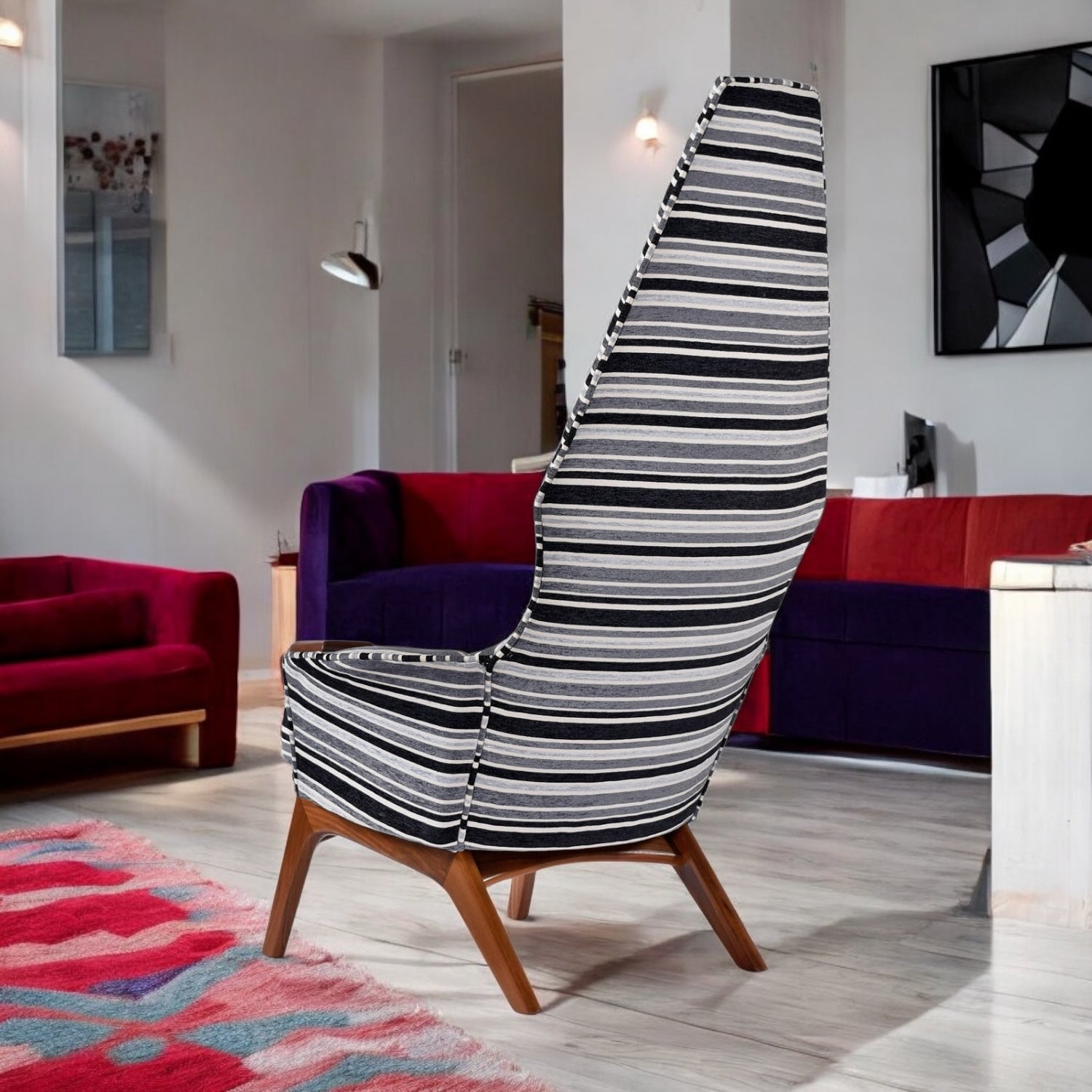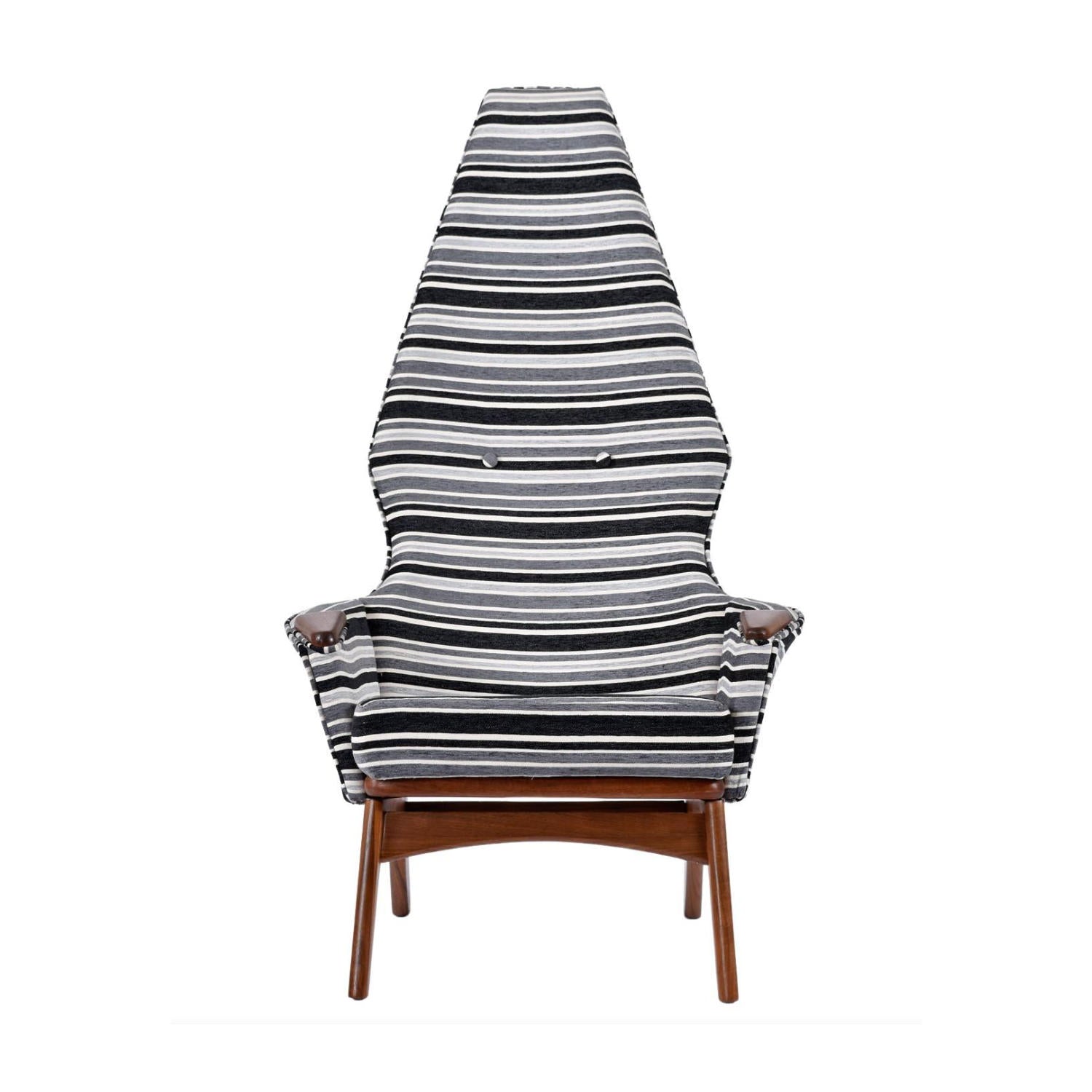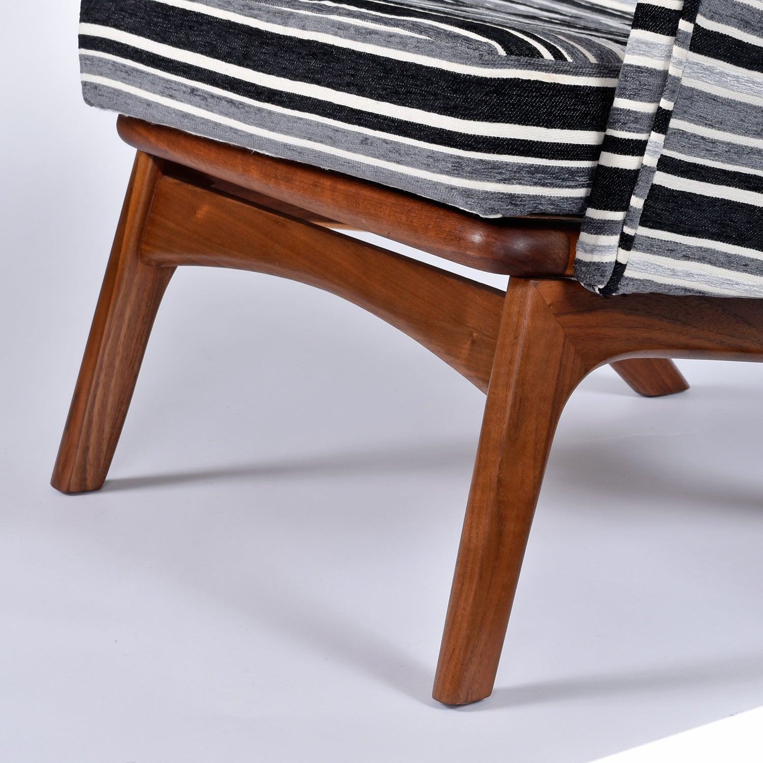 Striking Mid-century modern Adrian Pearsall for Craft Associates 2056-C lounge chair. The tufted, tapered high back profile evokes a regal sophistication that commands respect. Previous owner updated the chair with this new, plush, striped upholstery. The dramatic profile is achieved with a multifaceted form and striking tall back. Solid walnut pads on the arms and legs contrast beautifully against the material.