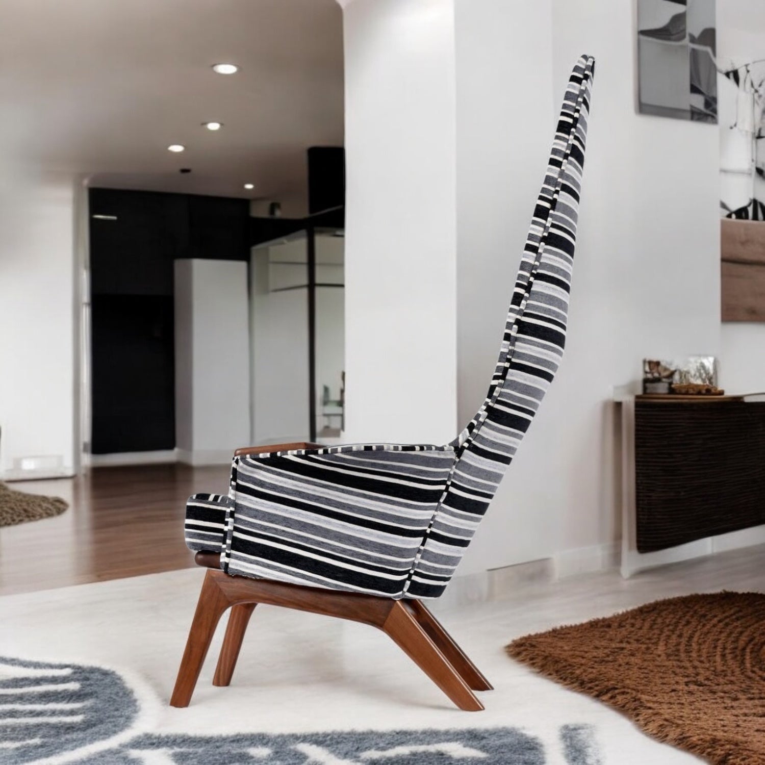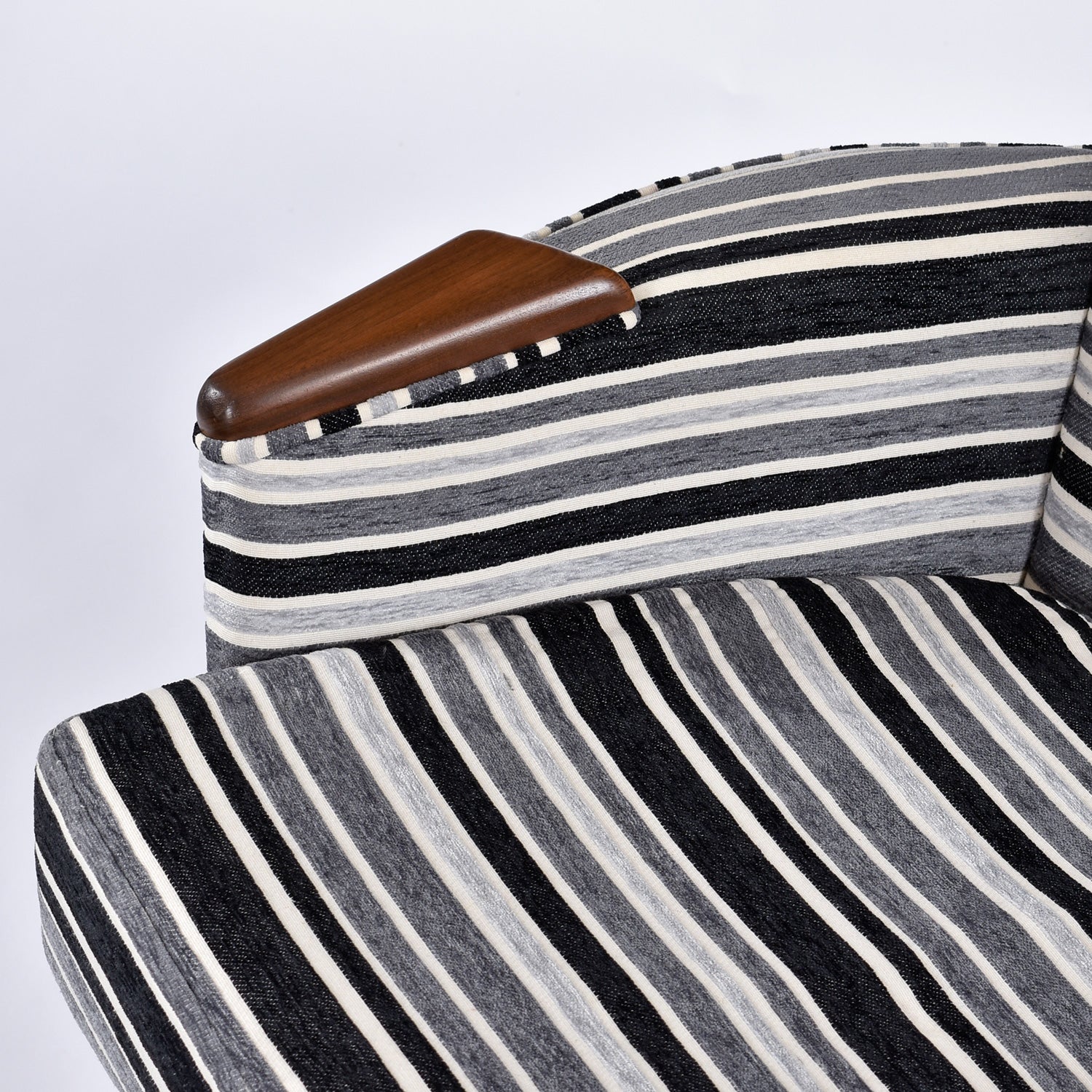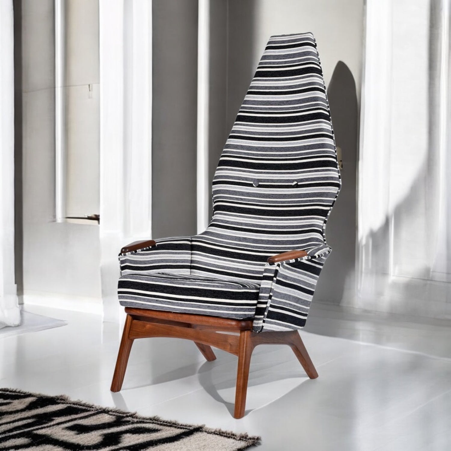 Striking Mid-century modern Adrian Pearsall for Craft Associates 2056-C lounge chair. The tufted, tapered high back profile evokes a regal sophistication that commands respect. Previous owner updated the chair with this new, plush, striped upholstery. The dramatic profile is achieved with a multifaceted form and striking tall back. Solid walnut pads on the arms and legs contrast beautifully against the material.