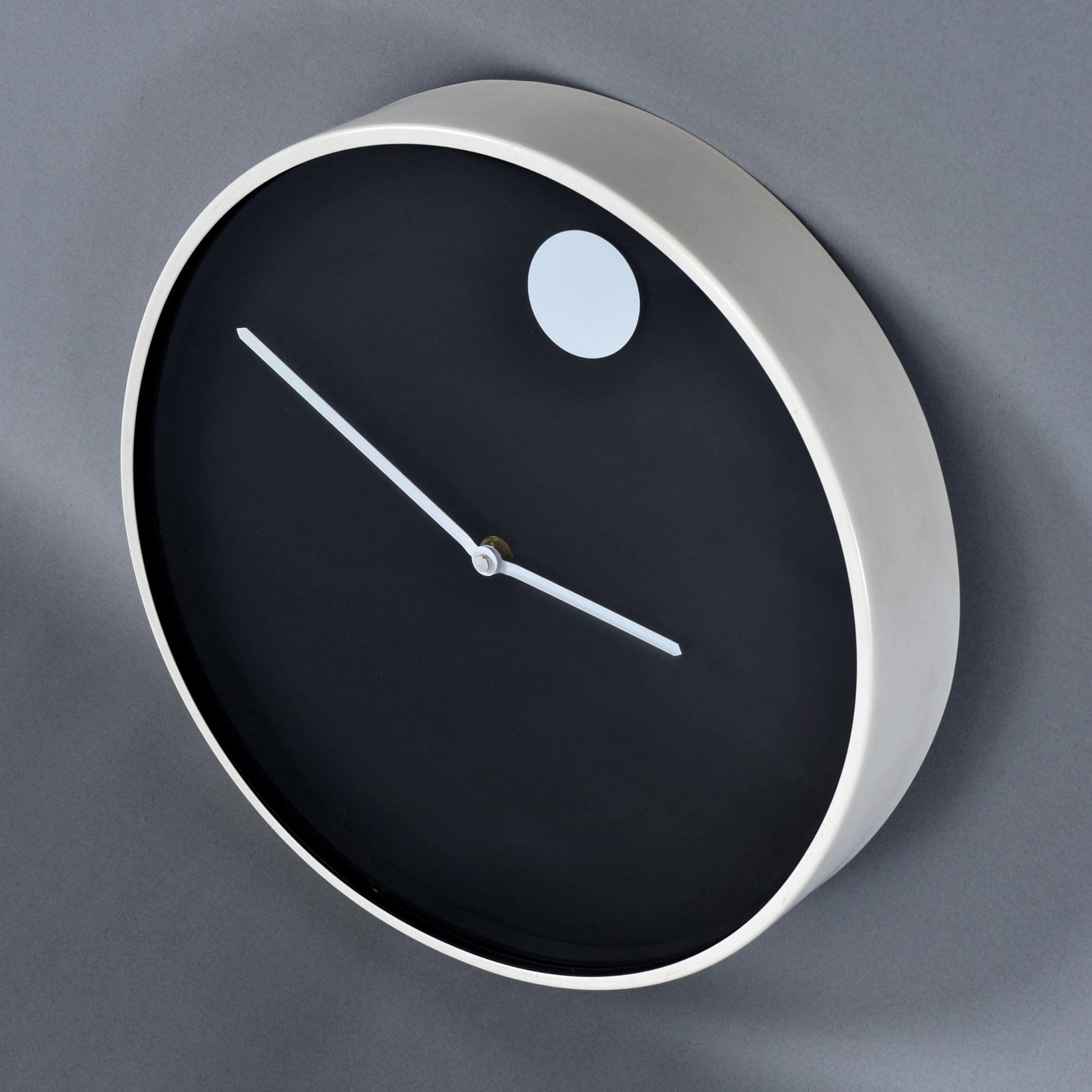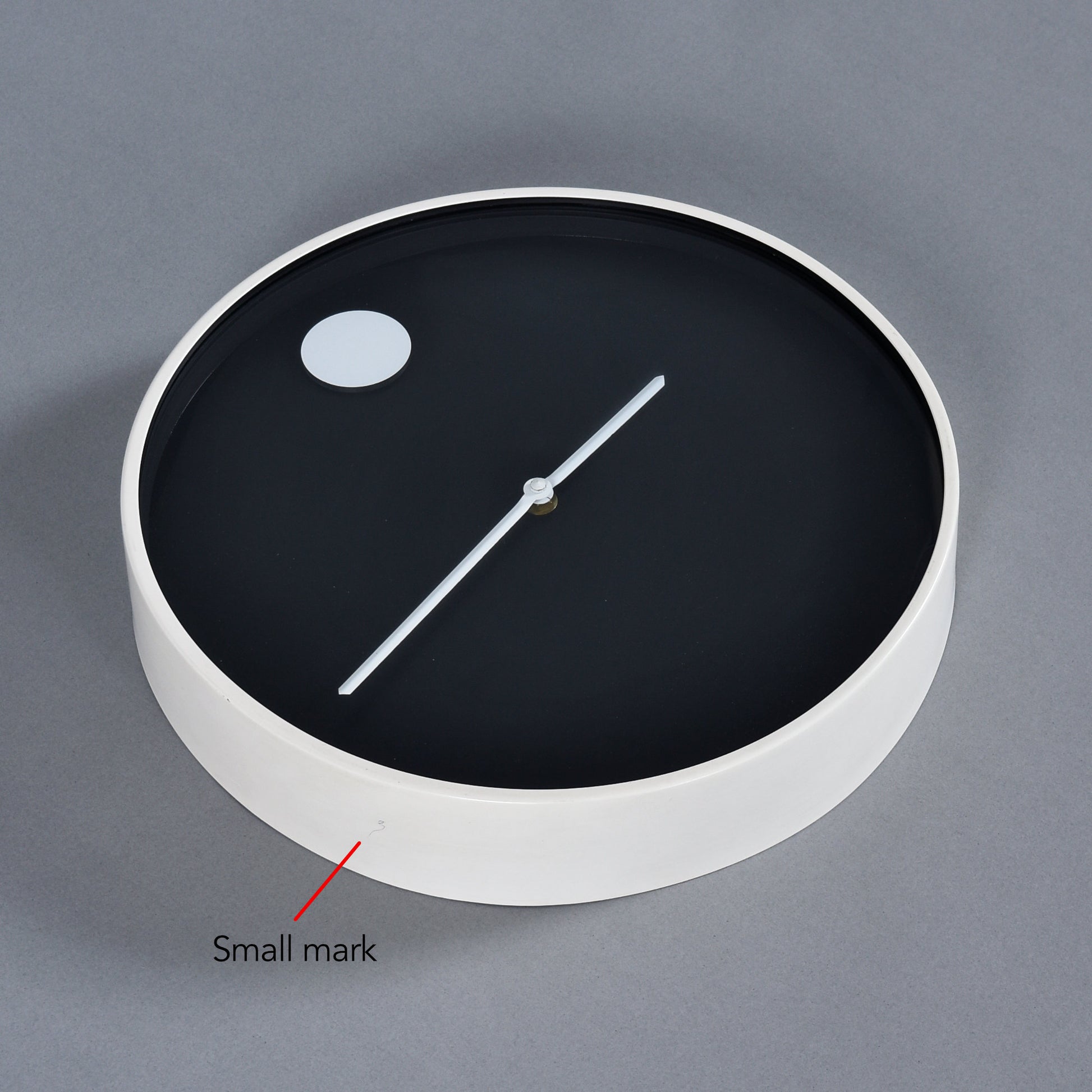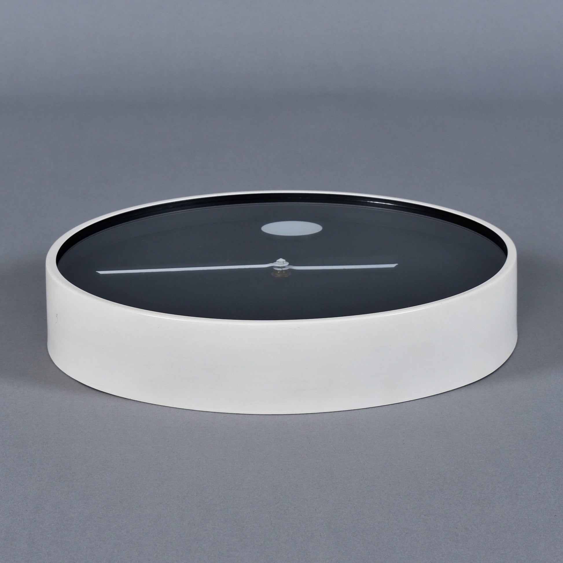 Beautifully preserved, vintage 1970s, Nathan George Horwitt Museum Clock. The clock was produced by Howard Miller of Zeeland, Michigan, USA. The Avant-Garde Modernist design features a black face with a single white circle indicating the 12 position. Two white hands rotate to indicate time. The body is white painted metal, glass covering the face, powered by a battery operated quartz movement.
