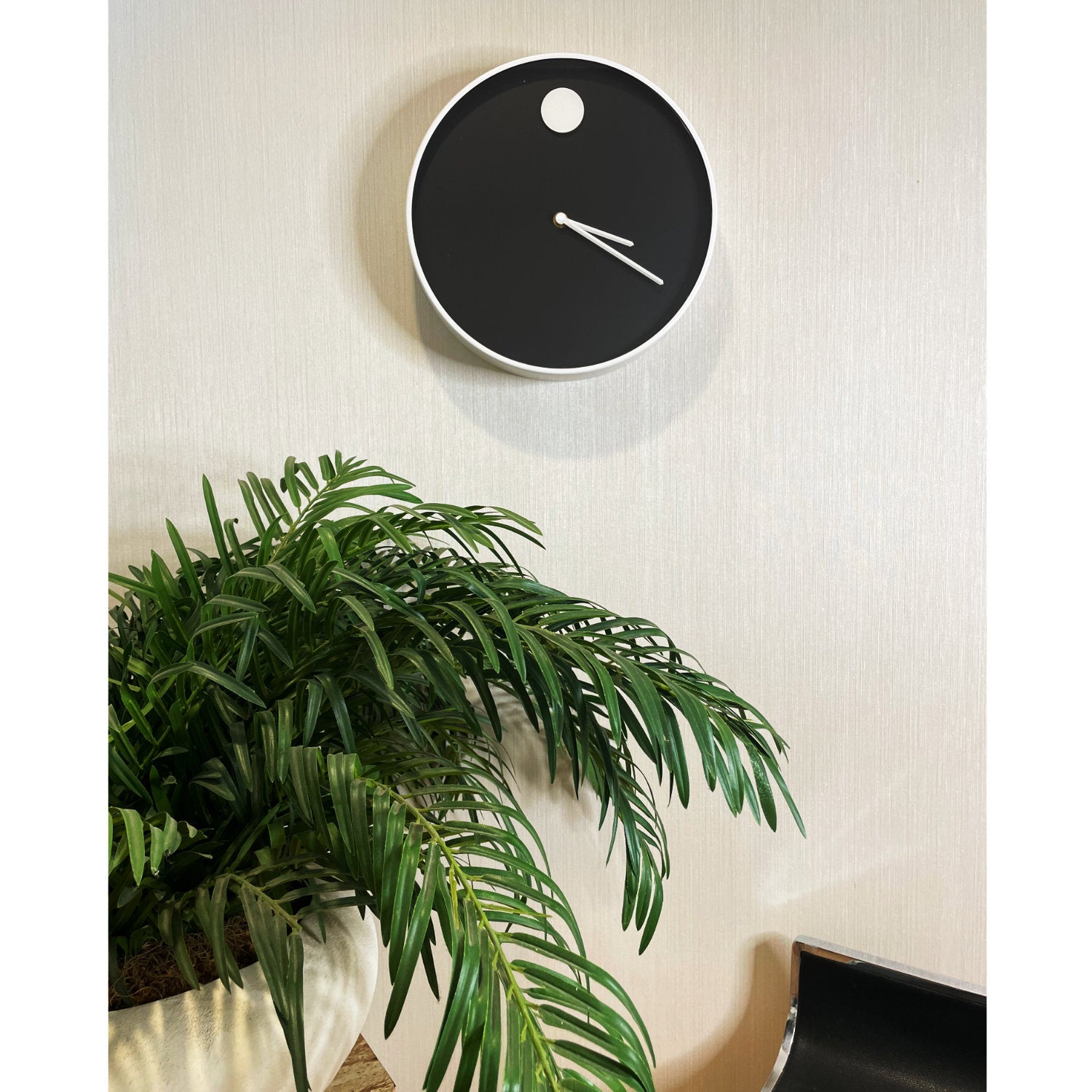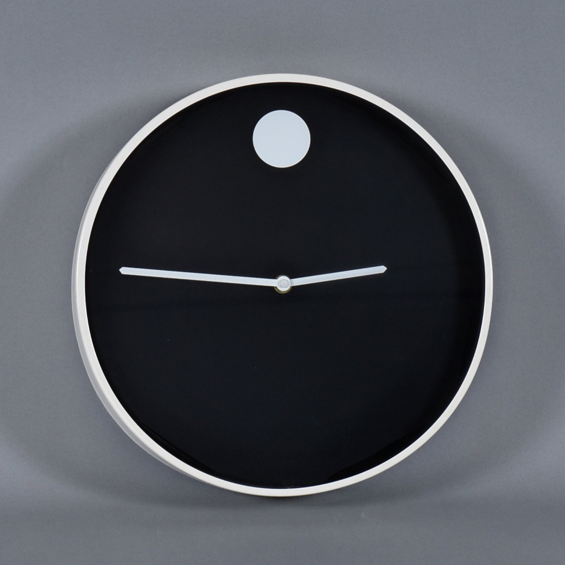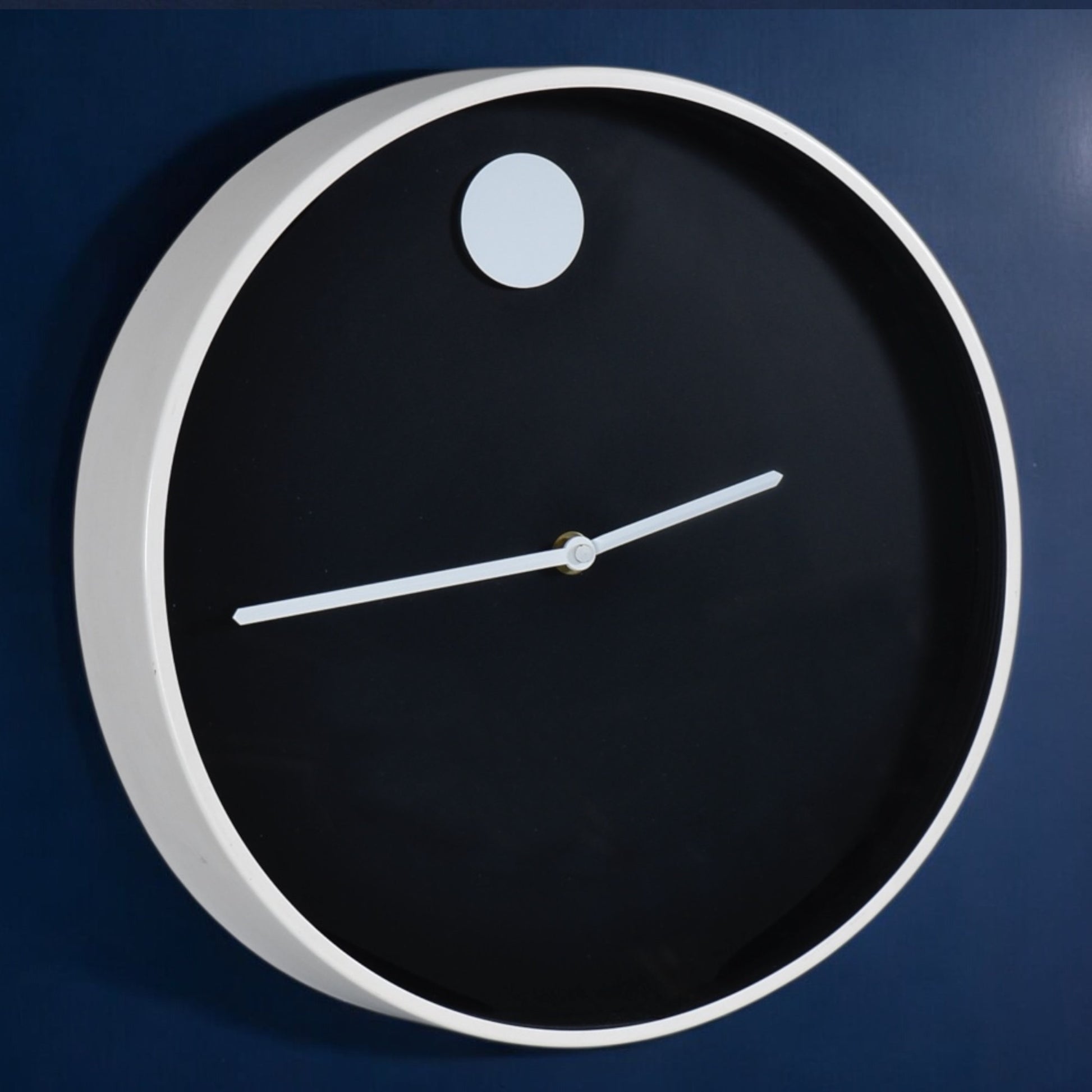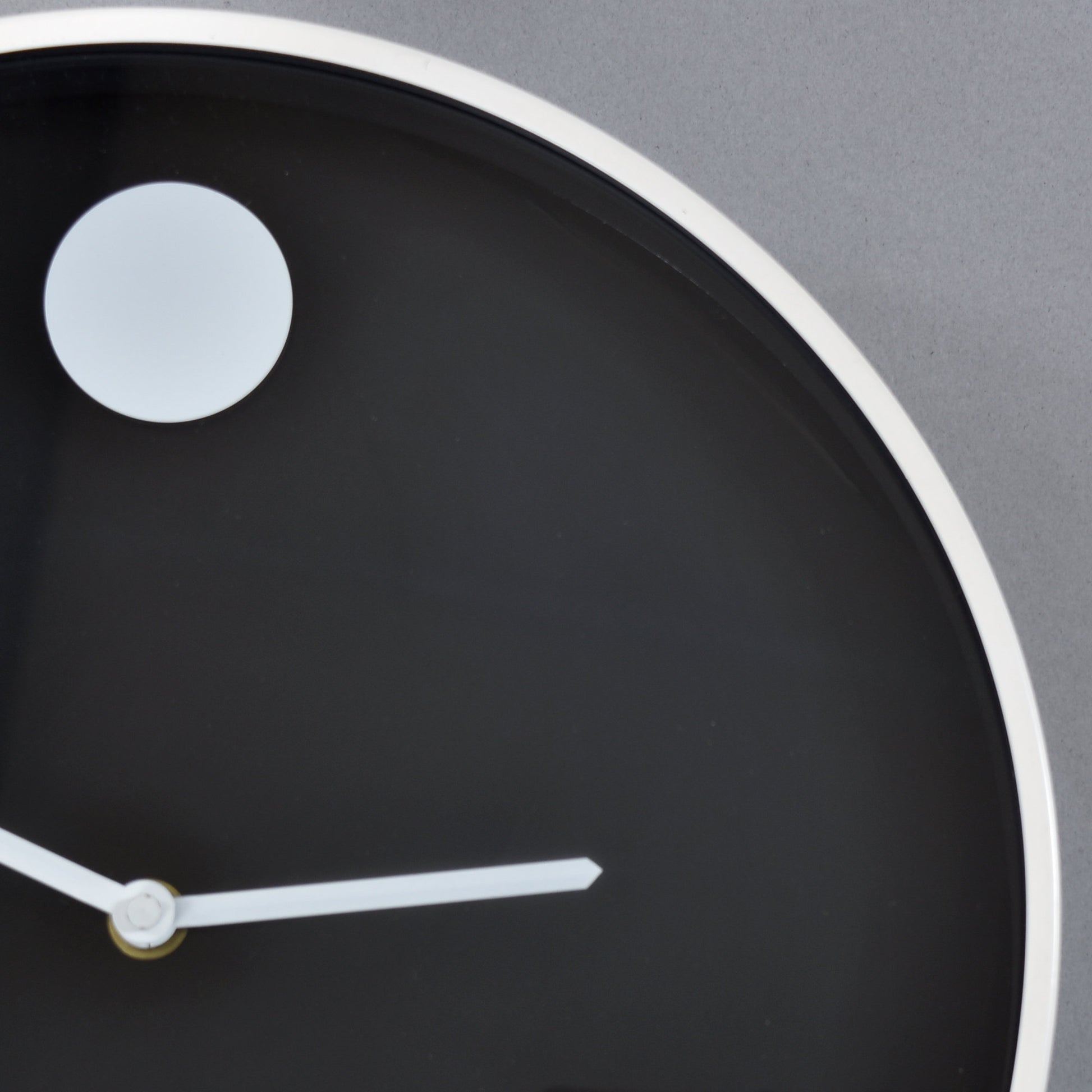 Beautifully preserved, vintage 1970s, Nathan George Horwitt Museum Clock. The clock was produced by Howard Miller of Zeeland, Michigan, USA. The Avant-Garde Modernist design features a black face with a single white circle indicating the 12 position. Two white hands rotate to indicate time. The body is white painted metal, glass covering the face, powered by a battery operated quartz movement.