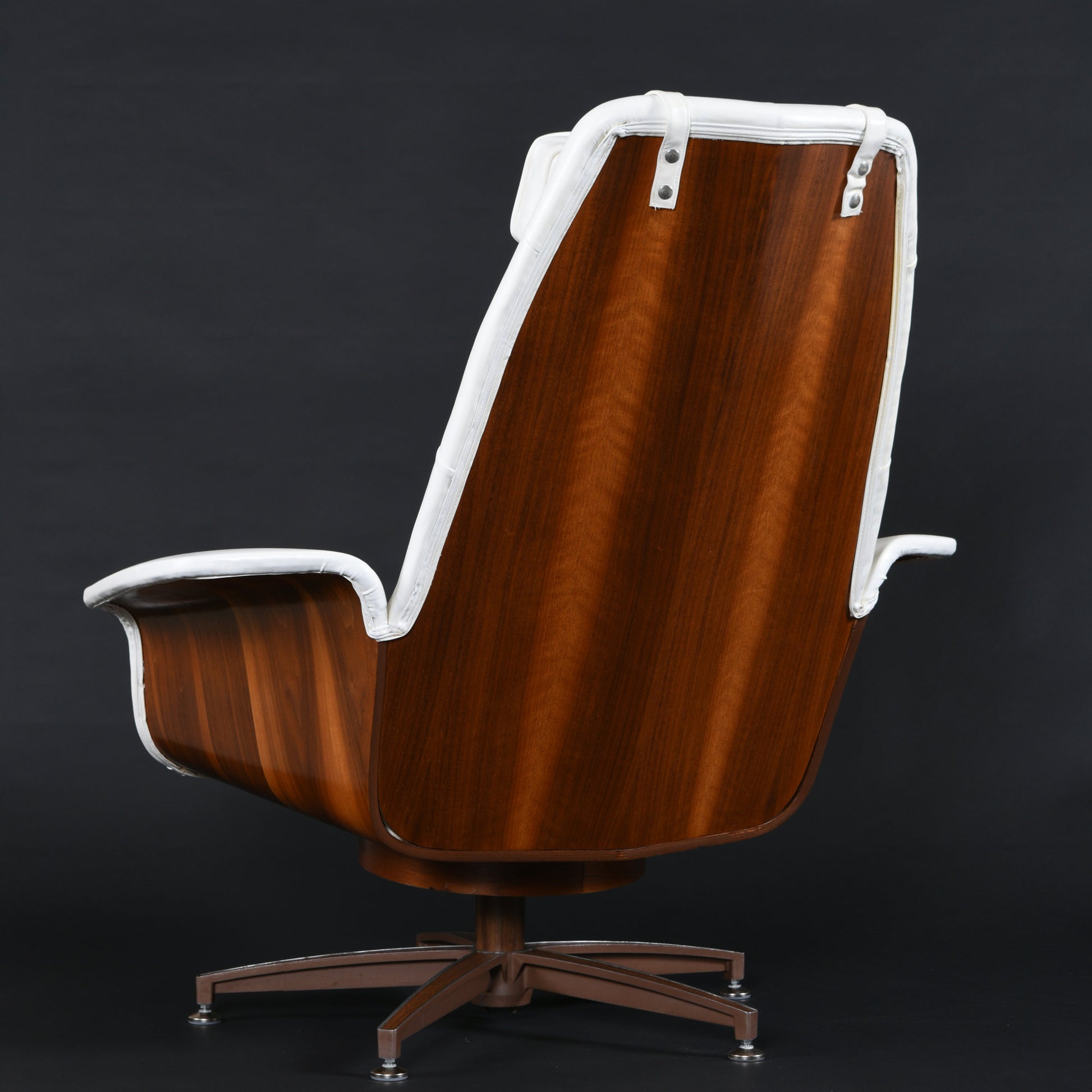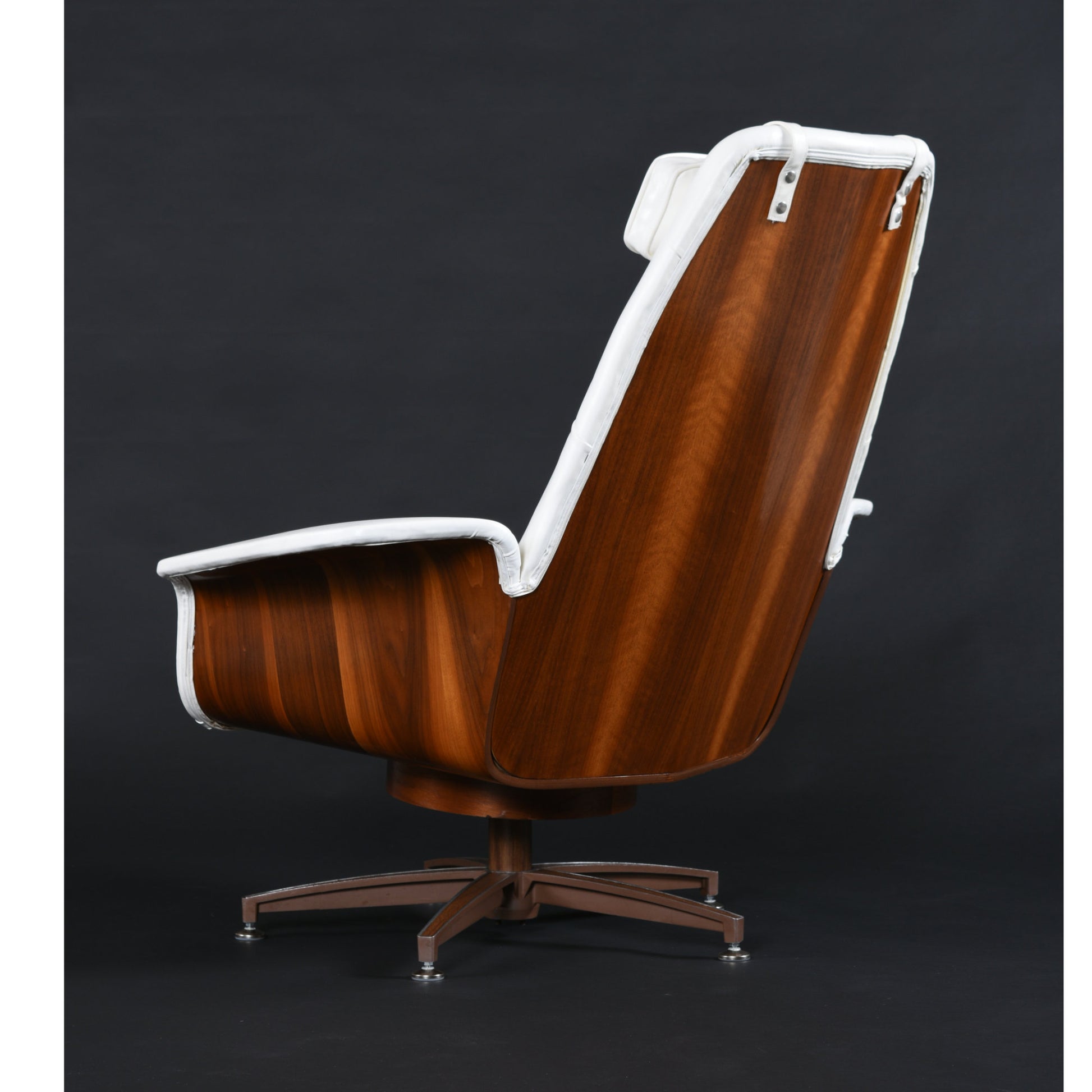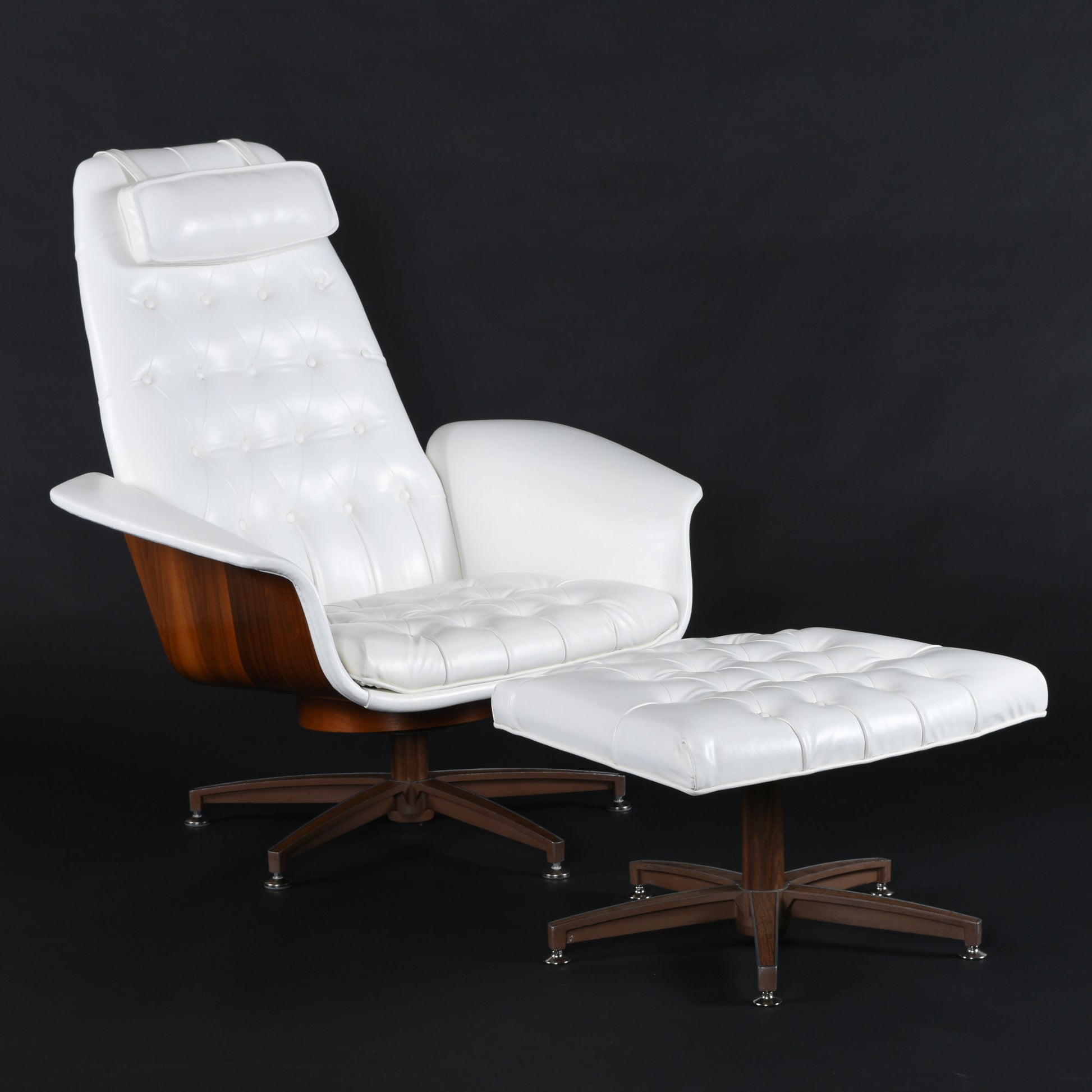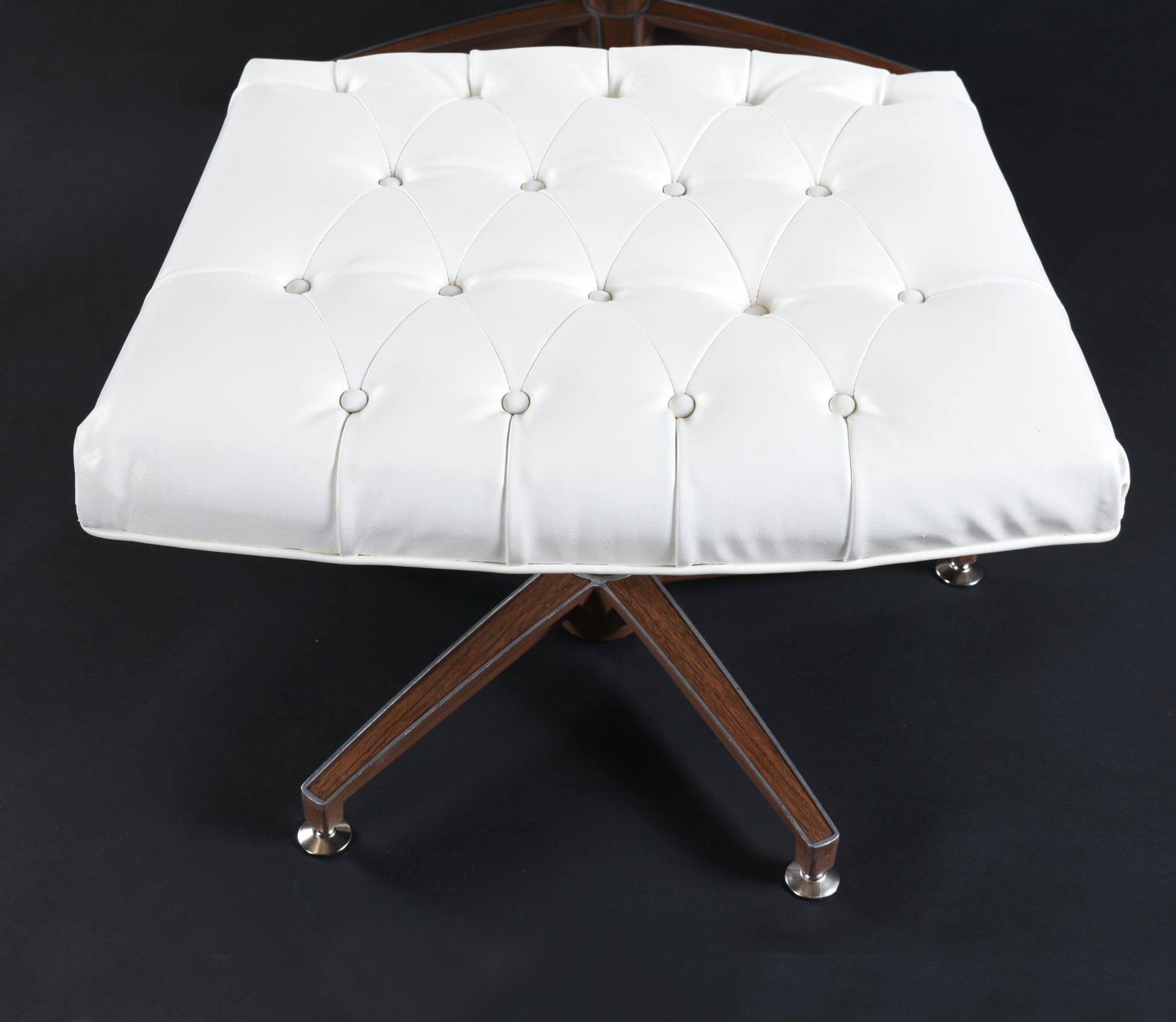 Beautifully restored Mid-Century Modern white lounge chair with ottomans designed in the manner of George Mulhauser’s “Mr. Chair”. The chic white tufted upholstery is absolutely exquisite. The walnut wood shells are the perfect compliment to the luxuriously tailored upholstery. Cool, casual, and comfortable in their skin. If this chais became sentient, they would ask for a highball and a cigarette.