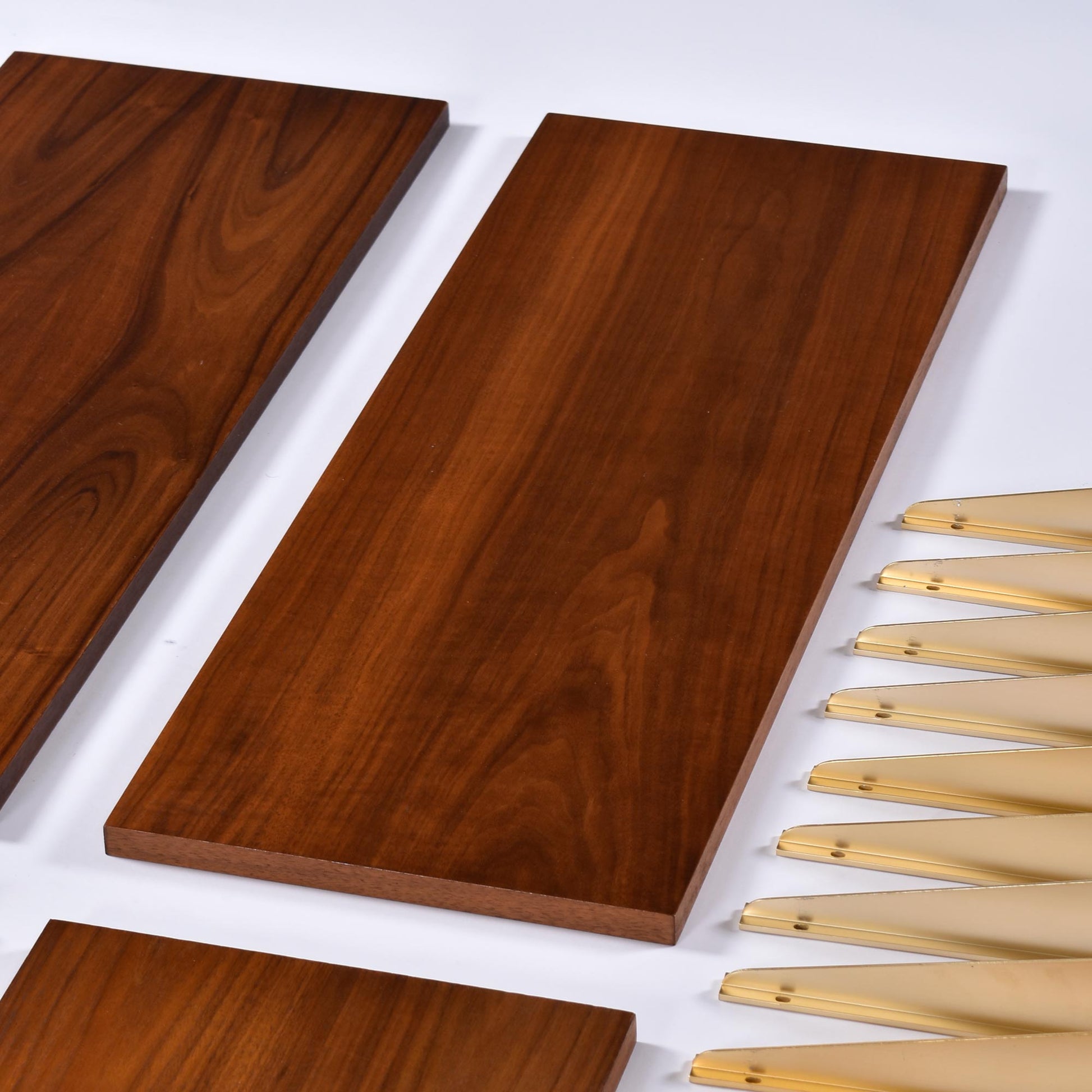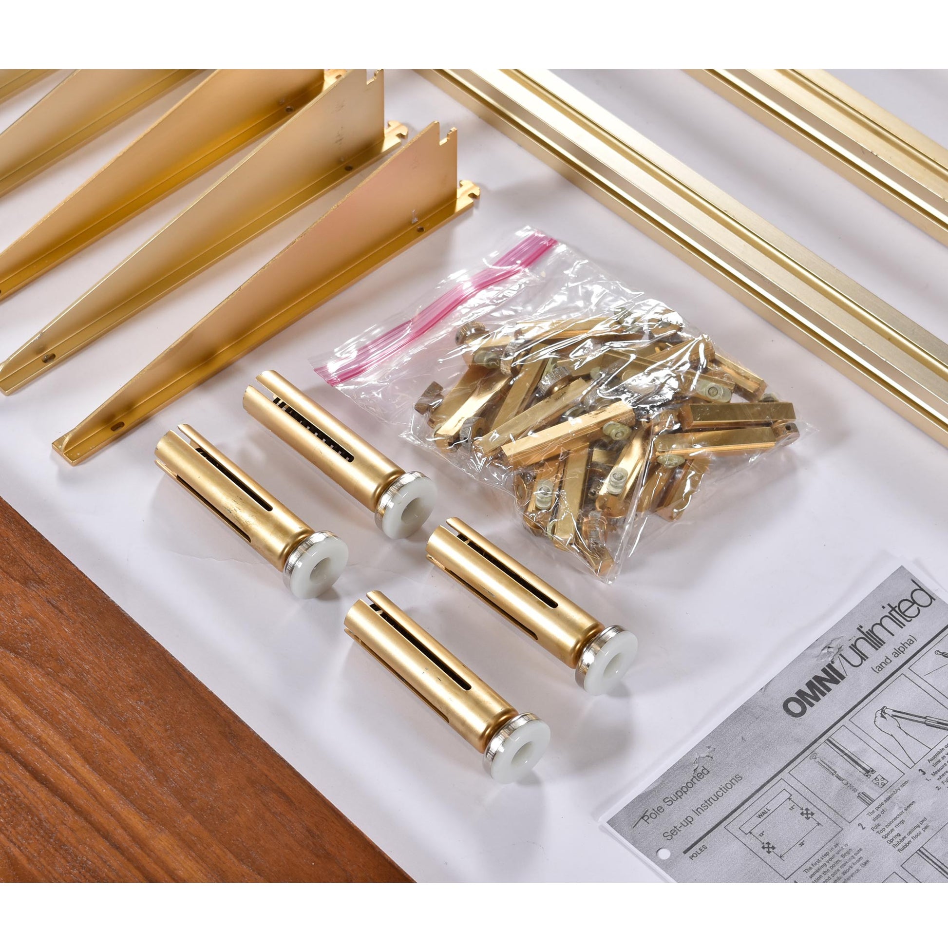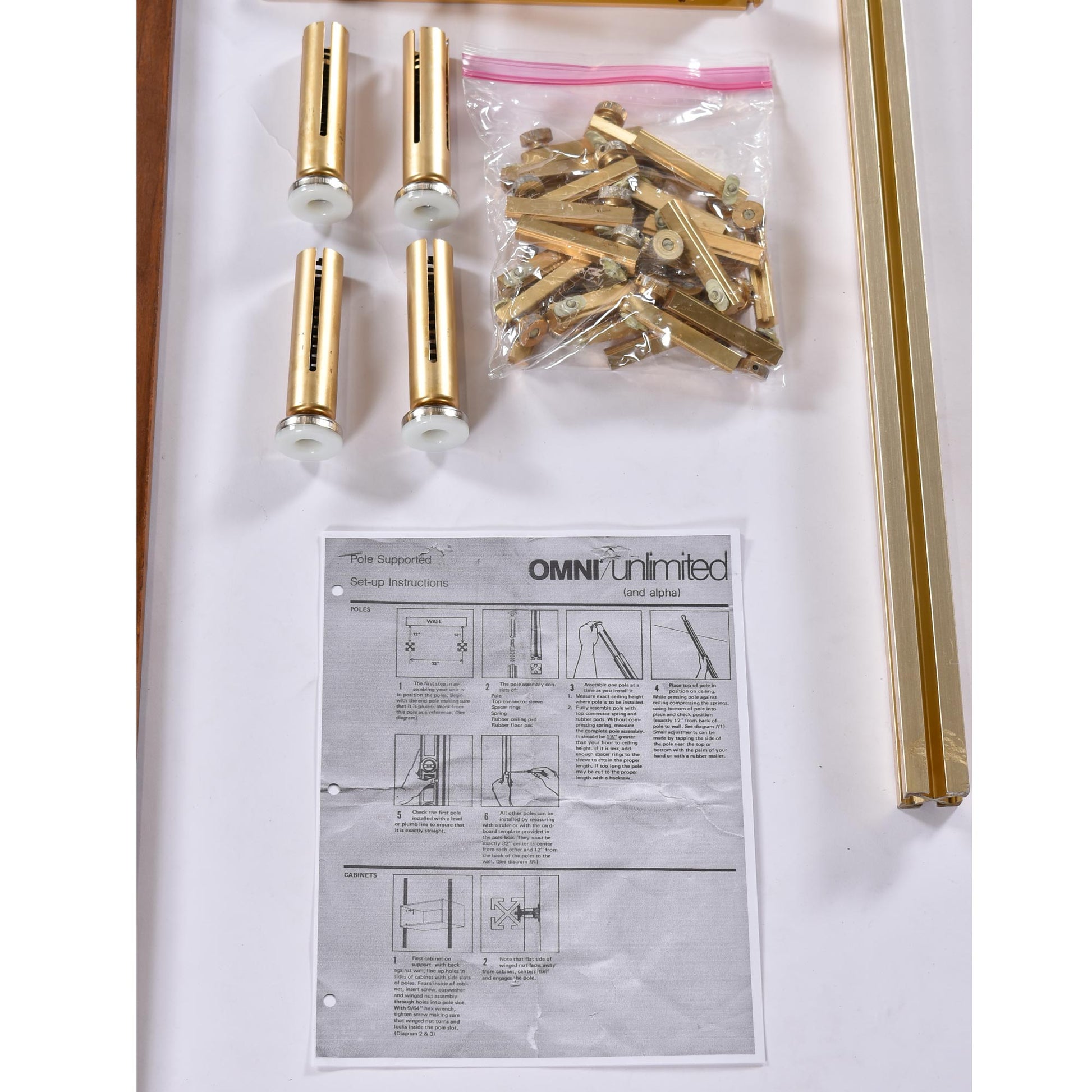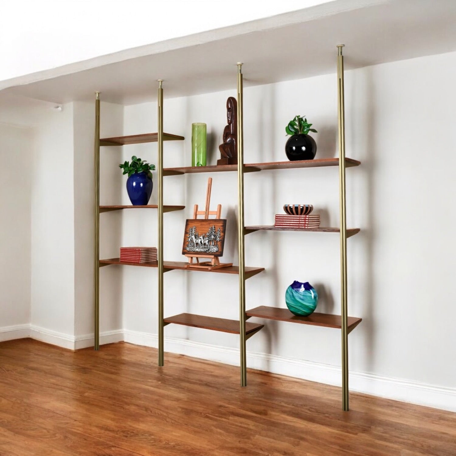 These rose gold aluminum tension poles are hard to find. The color and finish set the tone for this sleek and versatile wall unit. The "Omnibus" or "Omni" shelving system is a modern marvel designed by George Nelson. (4) spring loaded tension poles provide architectural support for (9) walnut shelves without the need to anchor into your wall (unless you want to). An additional set of two support spanners are included if your ceiling height doesn't provide the perfect tension. This 3-bay unit can be displayed in reverse, with the poles against the wall, depending on your practical and esthetic preference. We love displaying the poles on the outside to make a bold statement and show off the awesome color. There are tons of extra shelf brackets too! Seriously, you could add another 8 shelves and still have some left over.