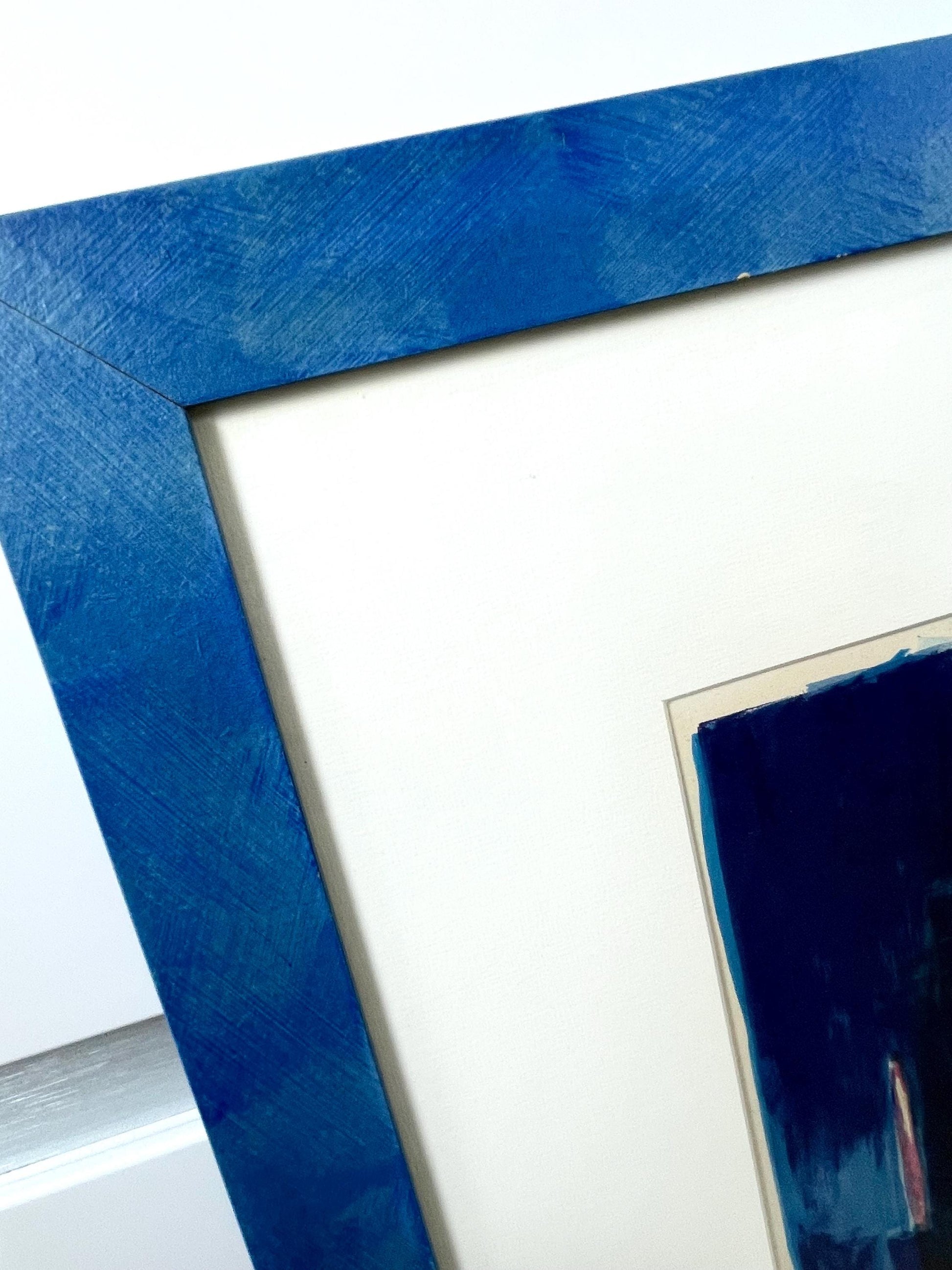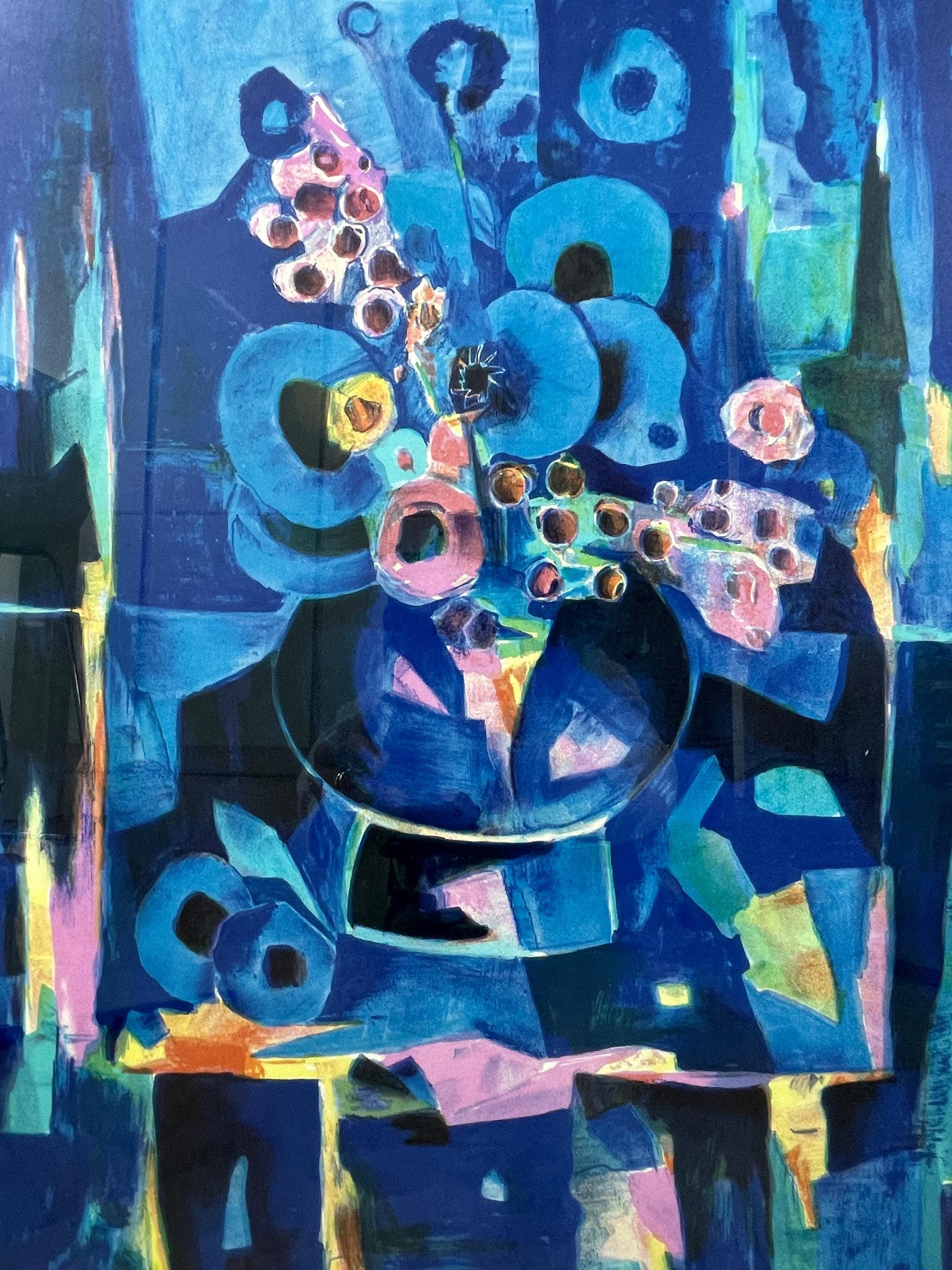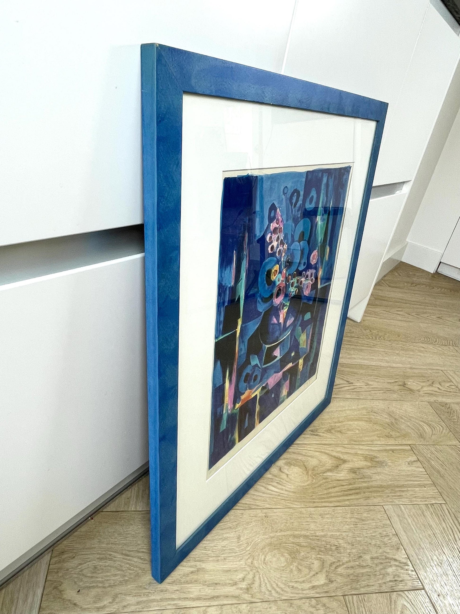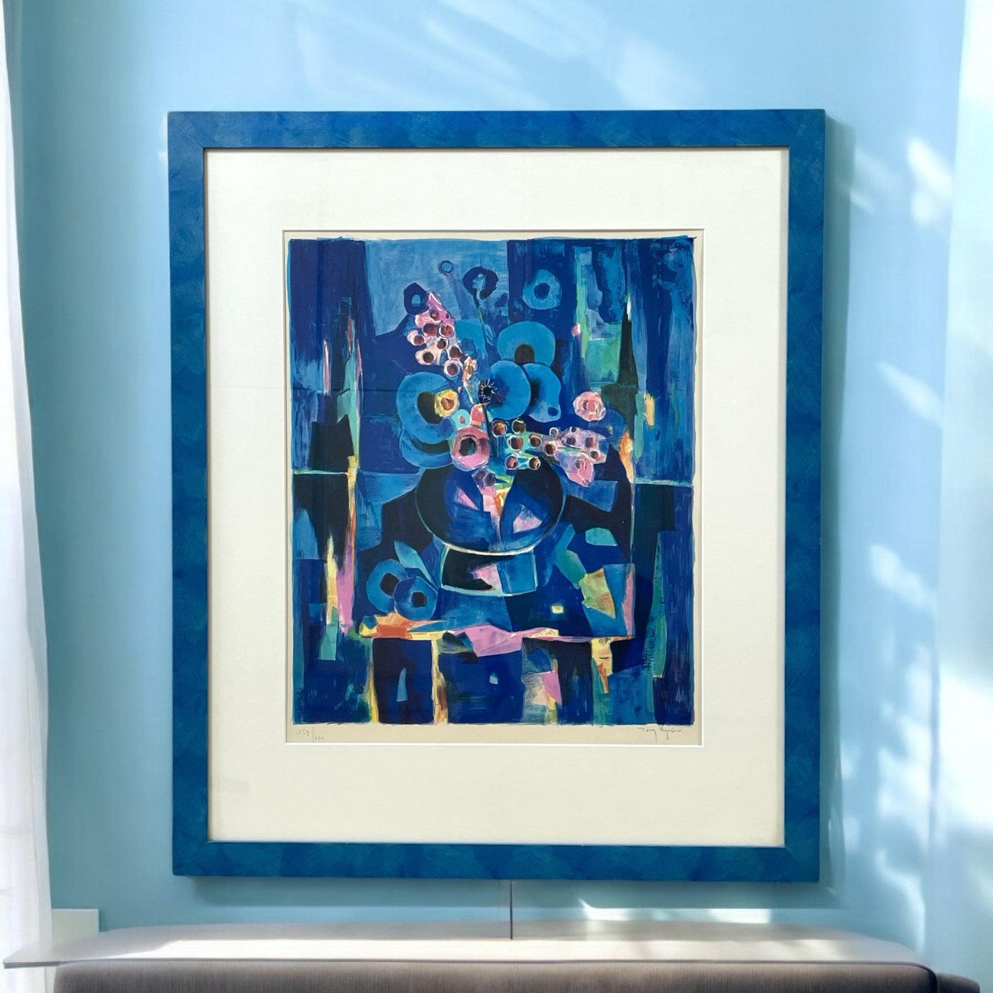 Pencil signed and numbered, limited edition Tony Agostini lithographic print. "Bouquet Au Vase Bleu" is numbered 159/180, printed in 1980. The artwork is housed in an incredibly beautiful cobalt blue frame. Take a close look at the frame to see the lovely brushed finish. The art was custom framed to high spec. A panel of acrylic protects the artwork.