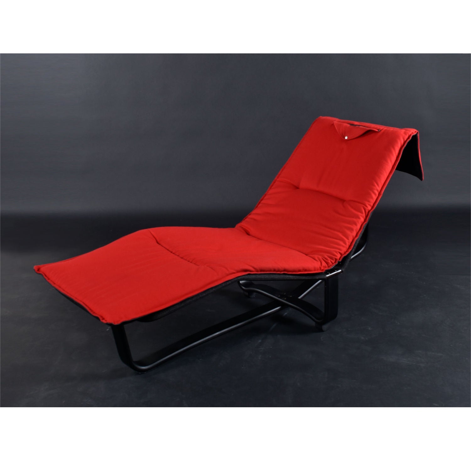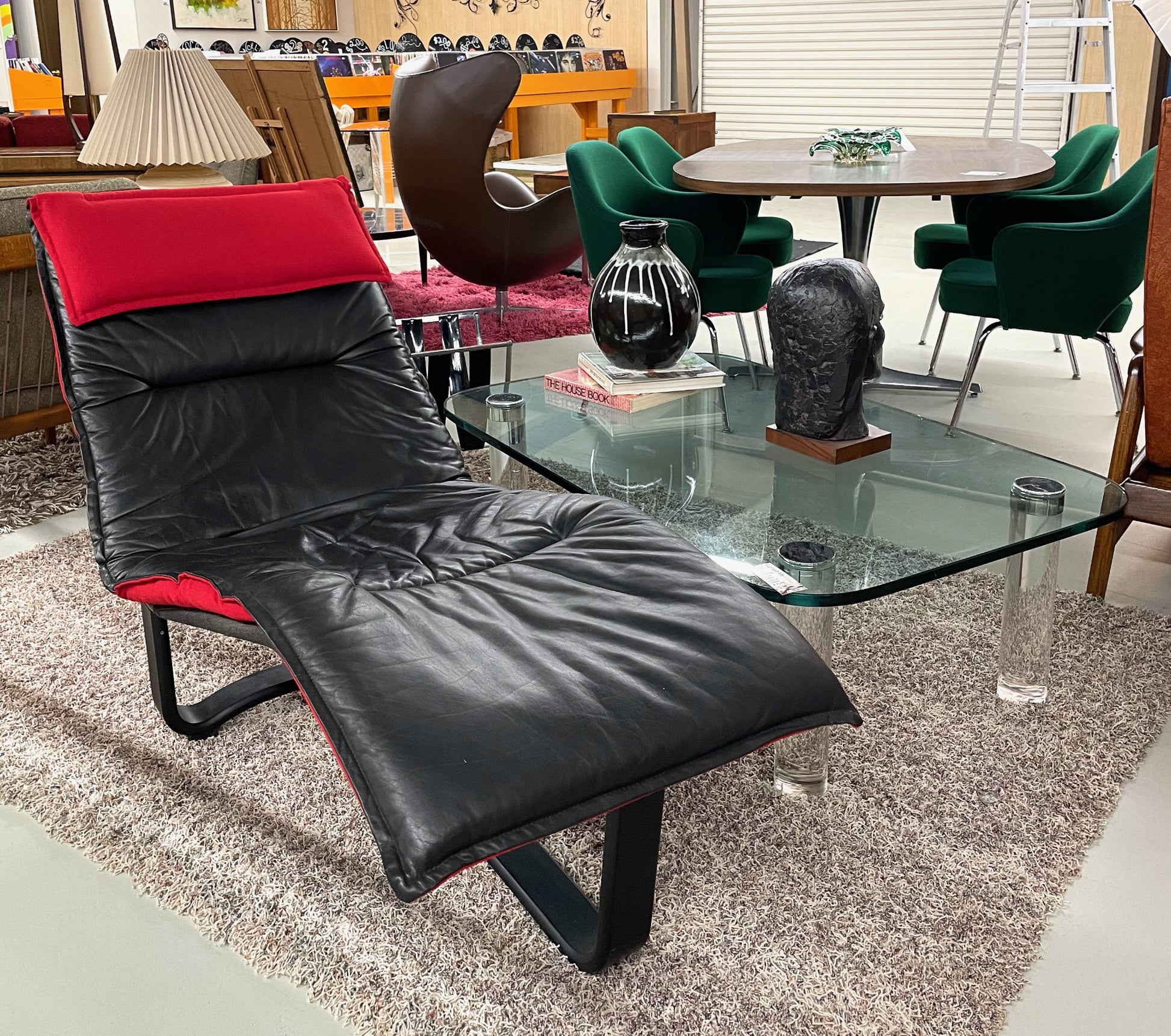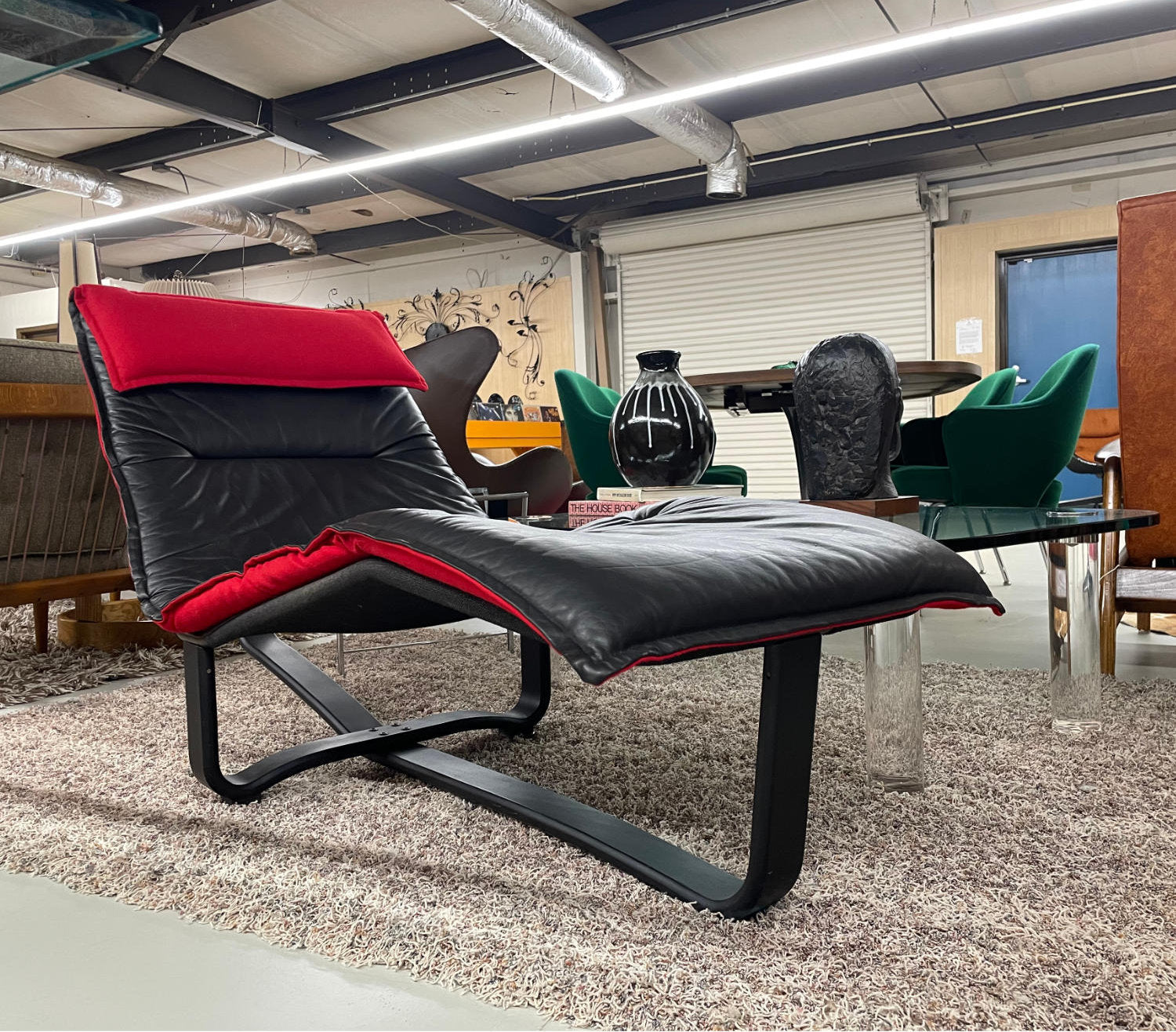 Westnofa Norwegian made leather chaise lounge with reversible cushion. This chaise is exemplary of Scandinavian design genius. It achieves so much, by such simple means. The original cushion is black leather on one side, and red wool on the other side. The versatility does not end there. The flap at the top of the chaise is actually a pillow. Fold that flap forward to create a pillow. Flip it back to drape over the top edge when not in use. Wait… there’s more! The chaise can rest at the “upright” slightly reclined pitch. Put your foot on the floor and push back to recline. Now your feet are elevated and you’re poised for a perfect bit of rest.